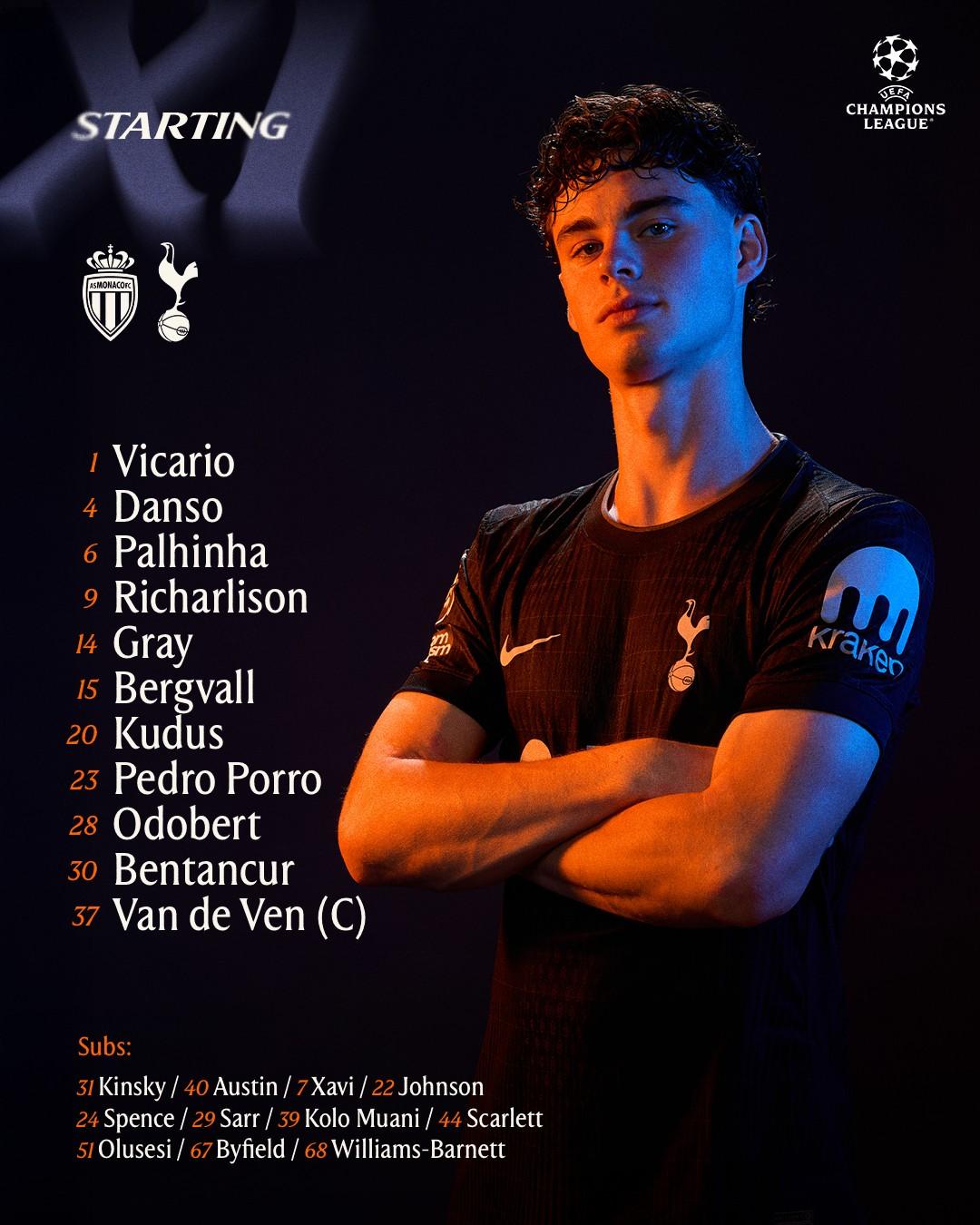 北京時間10月23日03:00,歐冠 聯賽階段 第3輪,摩納哥主場迎戰托特納姆熱刺,賽前雙方球隊首發名單公佈如下: