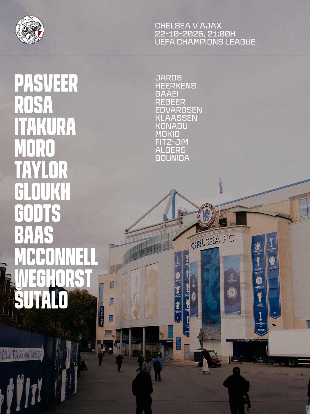 阿賈克斯首發:22-帕斯維爾、2-羅薩、4-板倉滉、37-舒塔洛、15-巴斯、16-麥康奈爾、10-格洛赫、8-泰勒、7-莫羅、25-韋格霍斯特、11-古茨