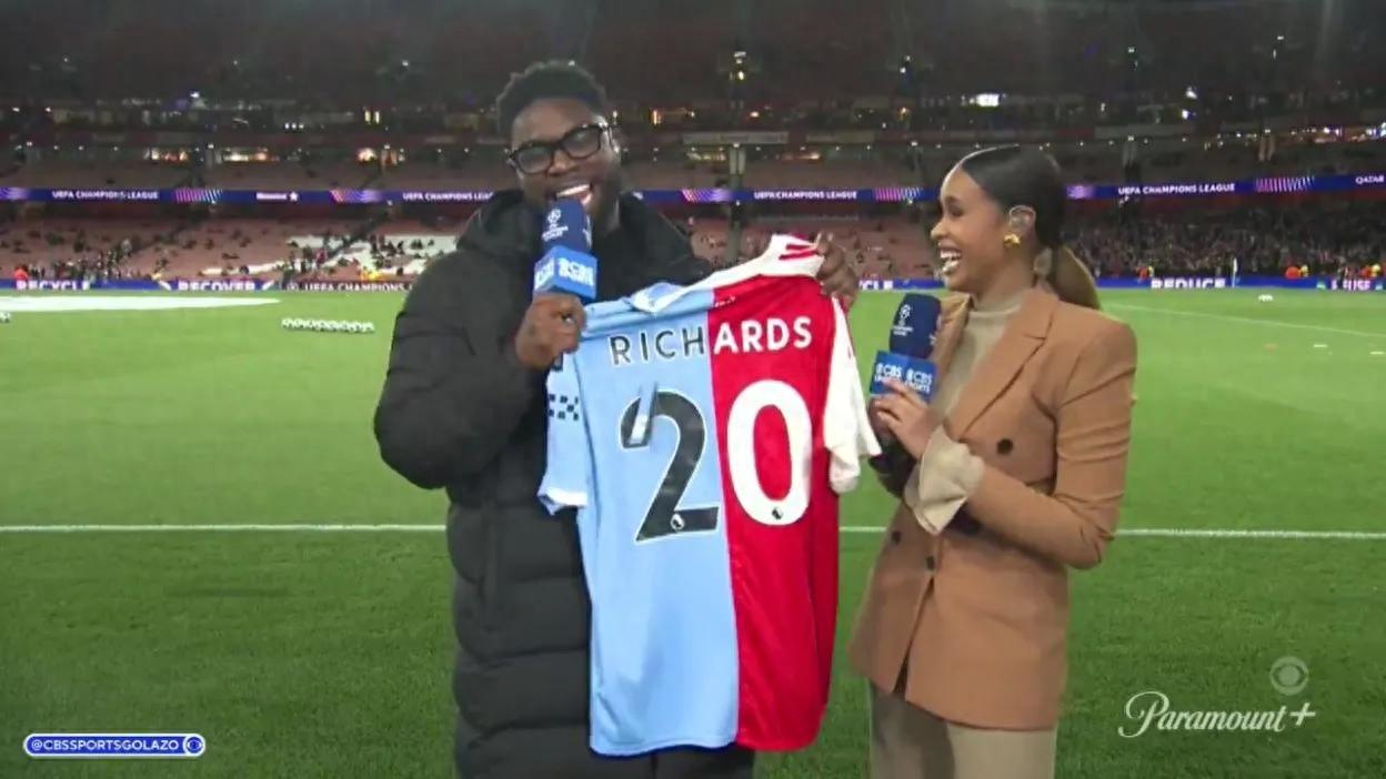 節目直播中,理查茲收到一件阿森納與曼城的縫合球衣
