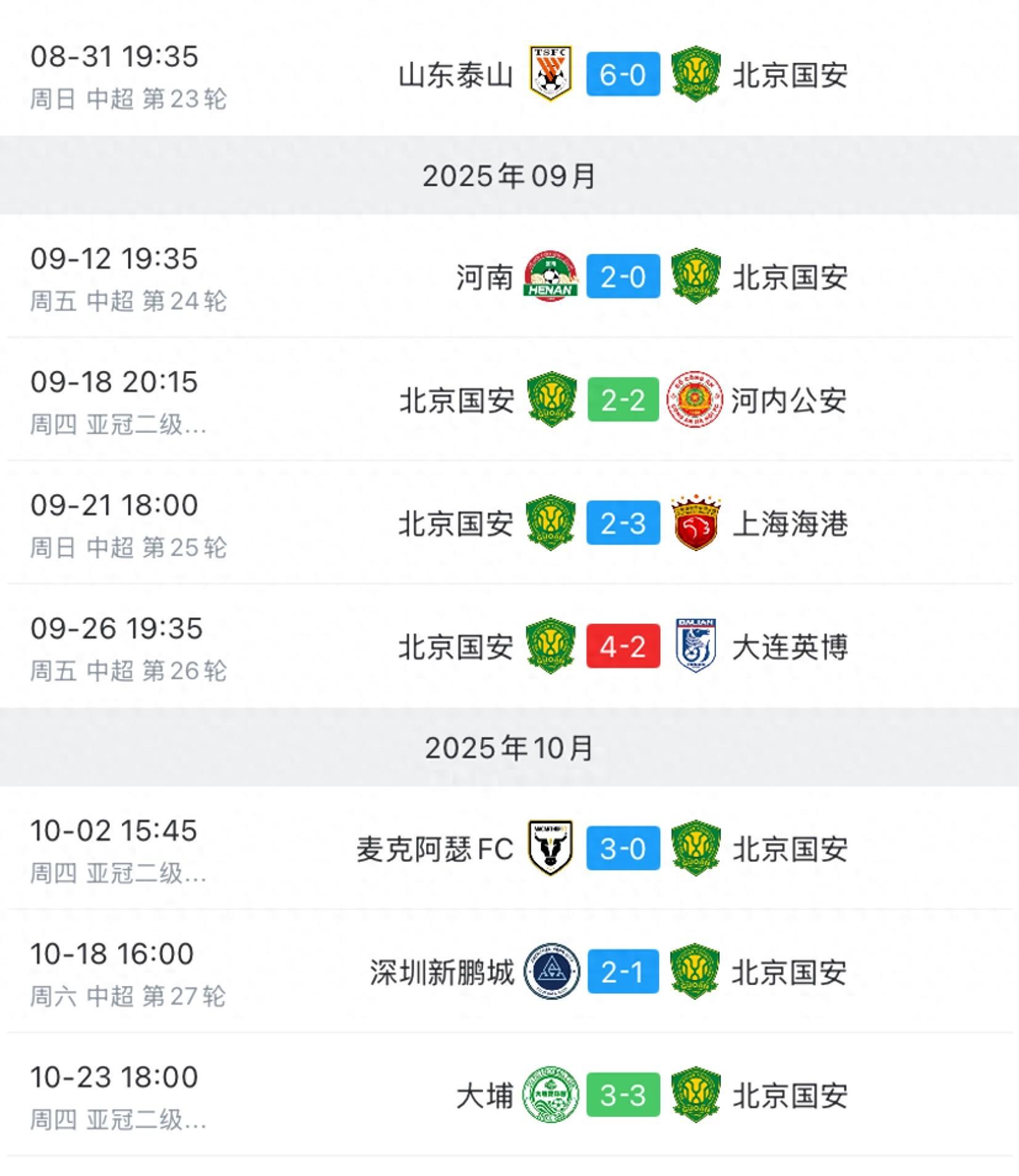 近8場比賽,國安每場至少丟兩球,總戰績爲1勝2平5負,只在主場4-2擊敗了大連英博。這8場比賽,國安防守端表現尤其糟糕,總共丟掉了23球。
