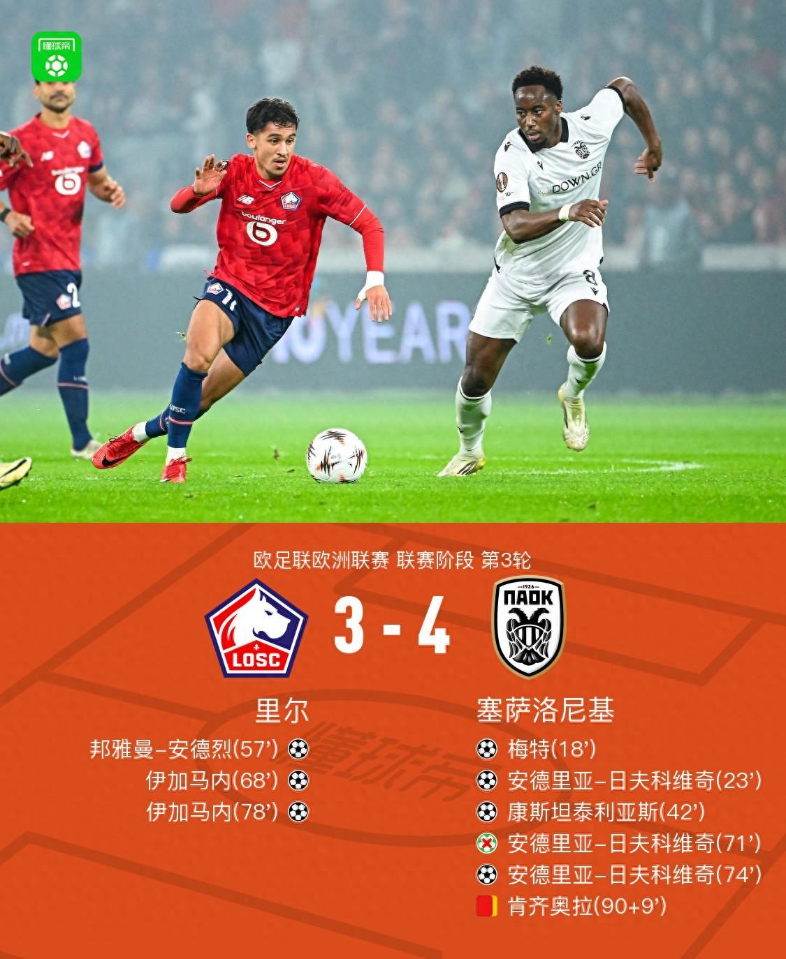北京時間10月24日歐足聯歐洲聯賽 聯賽階段 第3輪,里爾對陣塞薩洛尼基。里爾邦雅曼-安德烈破門,伊加馬內梅開二度。塞薩洛尼基梅特破門,安德里亞-日夫科維奇梅開二度,康斯坦泰利亞斯破門。最終比分里爾 3-4 塞薩洛尼基。