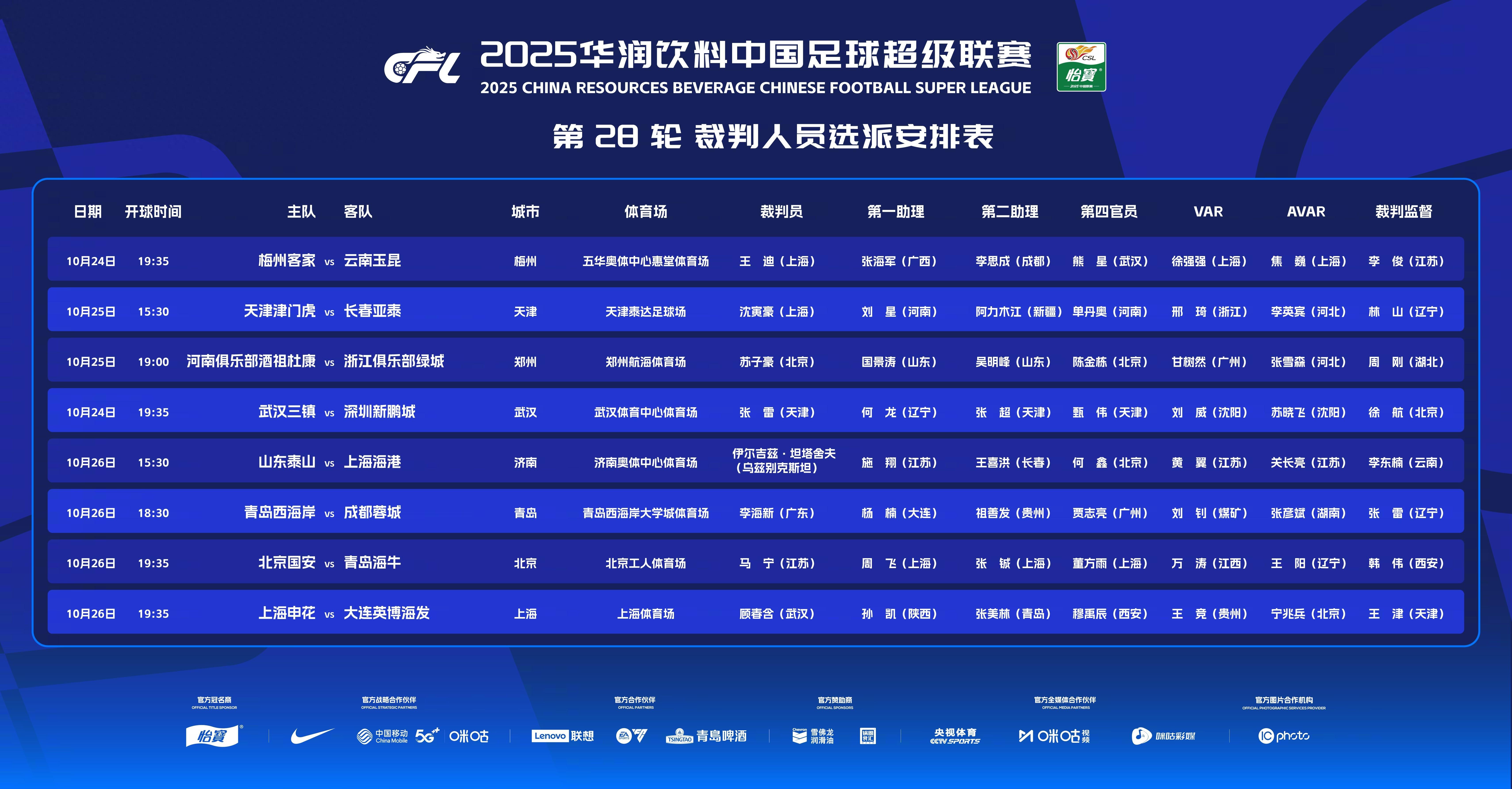 中超第28輪裁判:坦塔舍夫執法山東vs海港,馬寧吹國安vs海牛