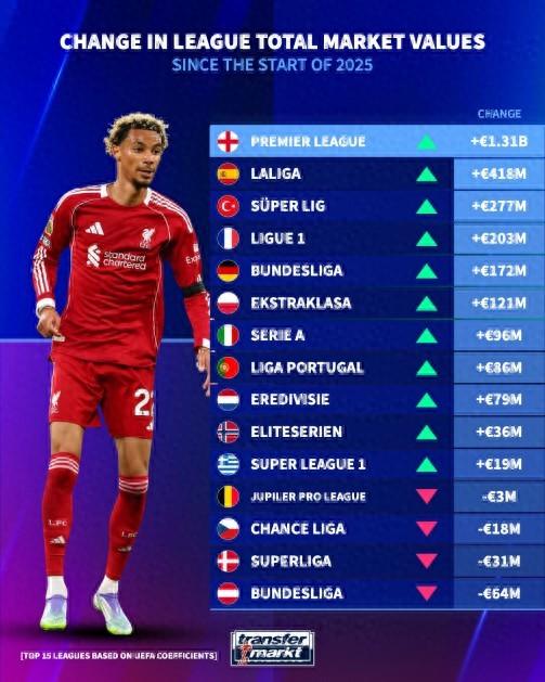 2025年歐洲15大聯賽身價漲跌榜:英超增加超13億歐元第一