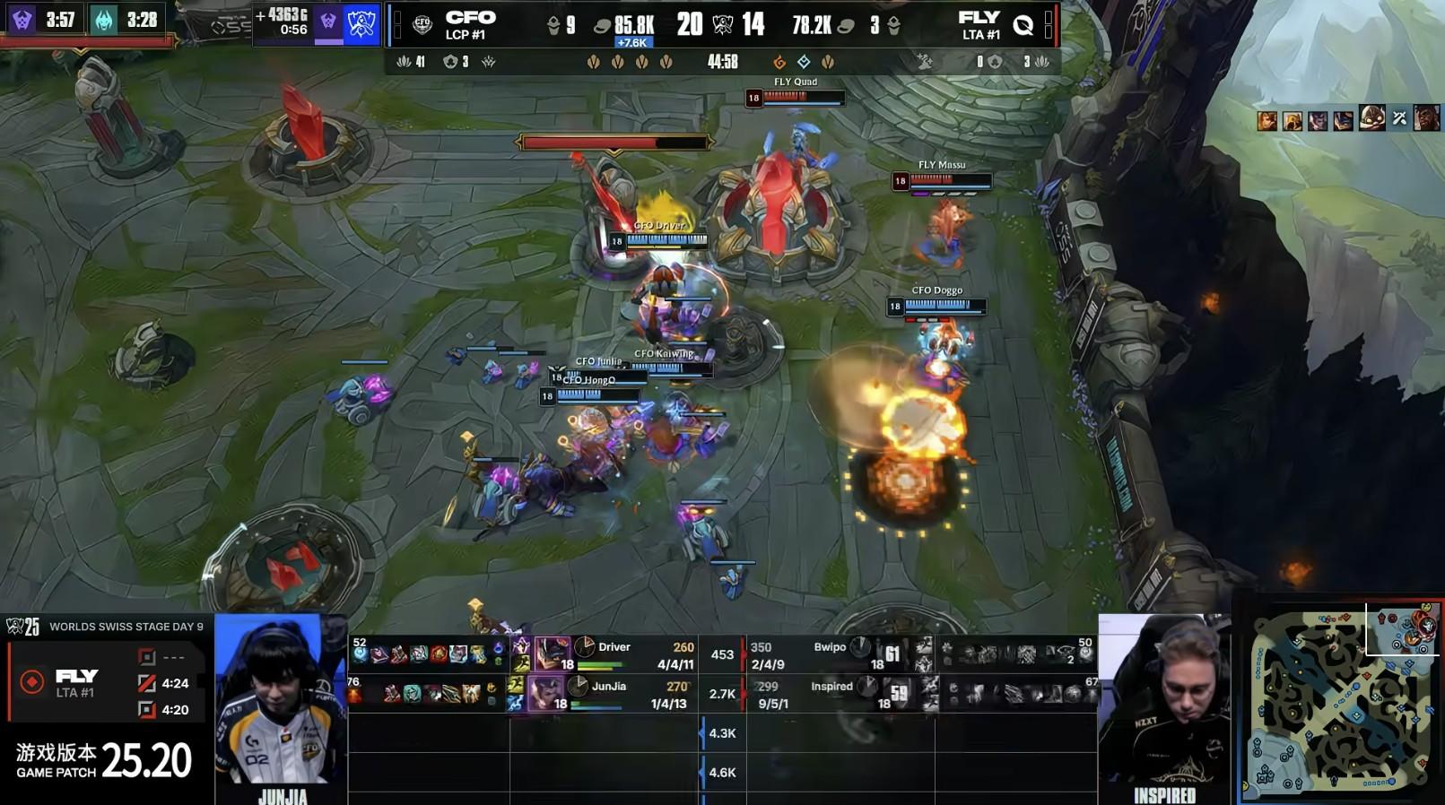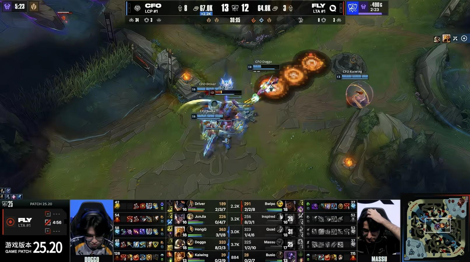 第14分鐘,CFO先動小龍但奎桑提來到正面之後,FLY連續擊殺CFO打野和AD,再拿下己方第二條小龍;