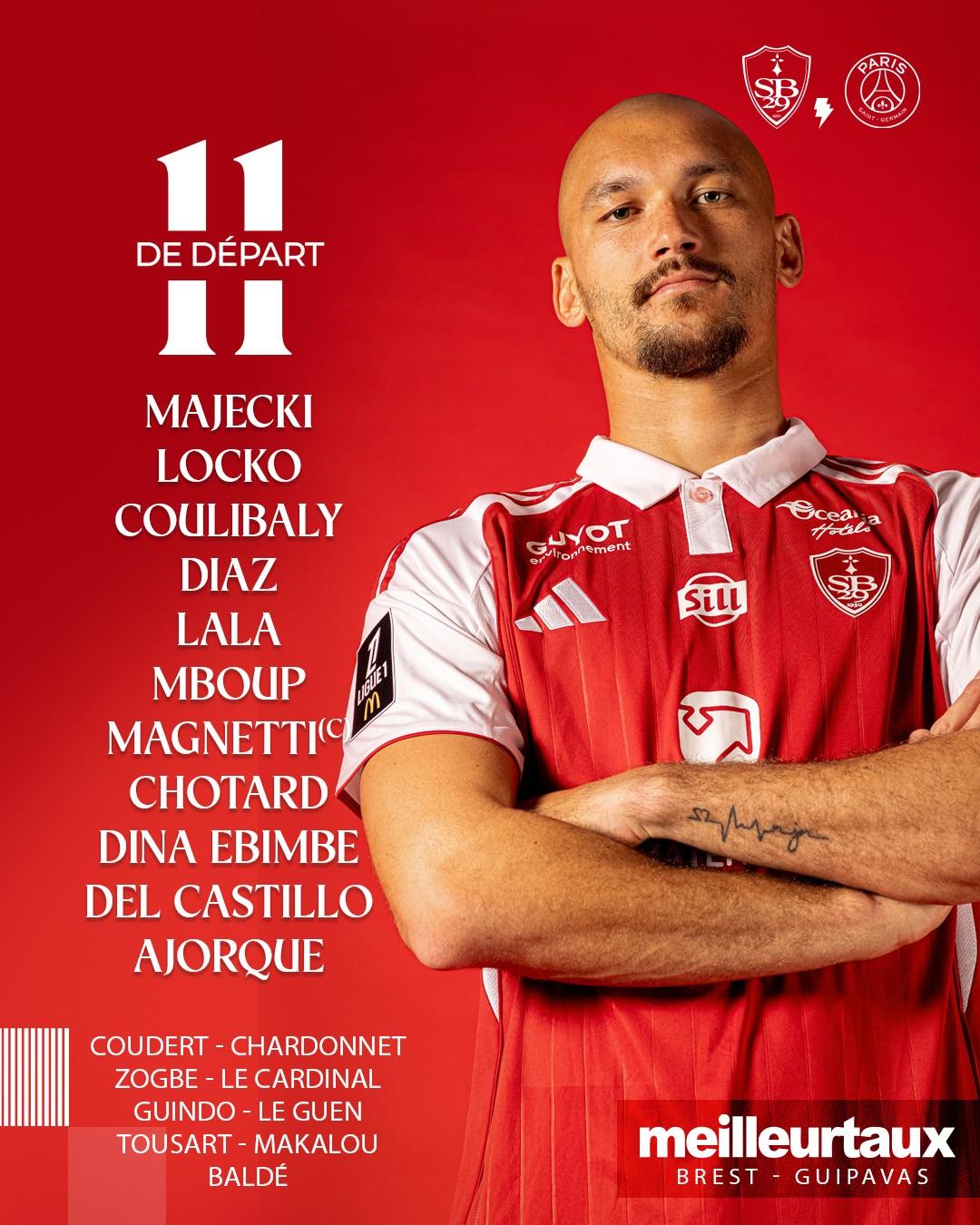 佈雷斯特首發:1-馬耶茨基、77-肯尼-拉拉、 4-米歇爾-迪亞斯、 44-蘇邁拉-庫利巴利、2-洛科、 13-肖塔爾、8-雨果-馬涅蒂、7-迪納-埃賓貝、 10-德爾卡斯蒂略、19-阿若克、 99-帕泰-姆布普
