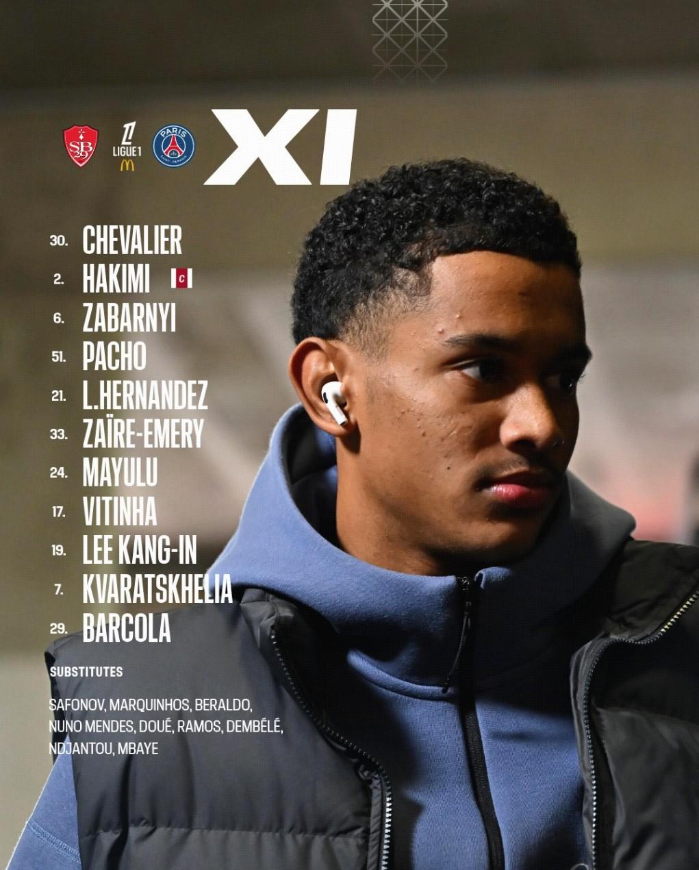 巴黎客戰佈雷斯特:阿什拉夫、巴爾科拉首發, 登貝萊替補