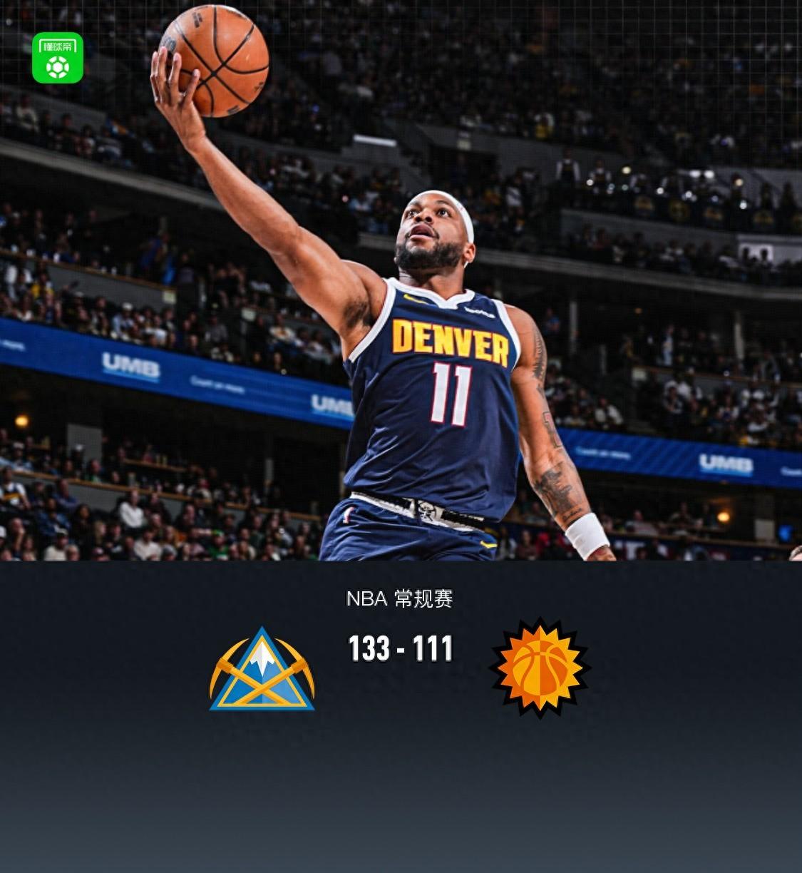 第四節掘金賈馬爾-穆雷拿下7分,太陽格雷森-阿倫拿下6分,最終掘金133-111戰勝太陽