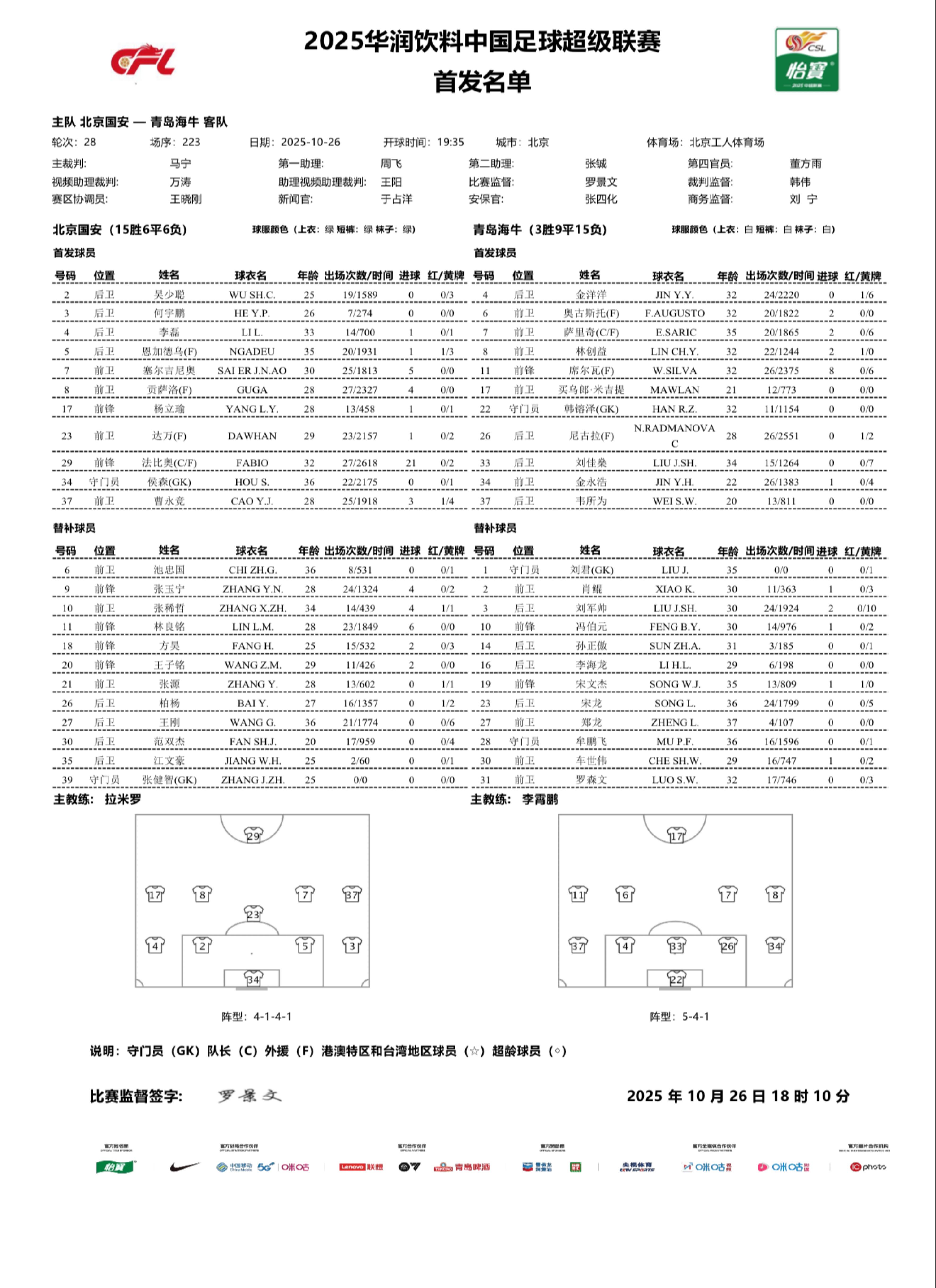 北京時間10月26日晚間19:35,中超聯賽第28輪,北京國安坐鎮主場北京工人體育場,迎戰青島海牛,本場比賽主裁判爲馬寧,視頻助理裁判爲萬濤,雙方首發名單:
