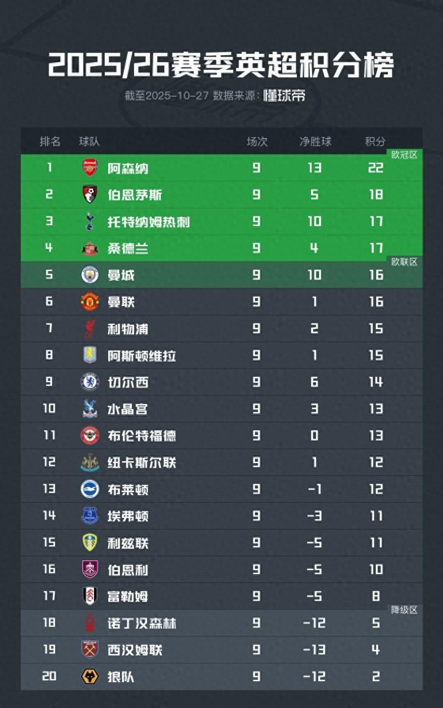 截至2025年10月27日,英超25-26賽季第九輪比賽全部結束。阿森納以22分高居榜首,與伯恩茅斯、熱刺和桑德蘭組成了新的“爭四集團”。而另一端的狼隊則持續低迷,開季至今僅取得2平7負,積2分墊底。