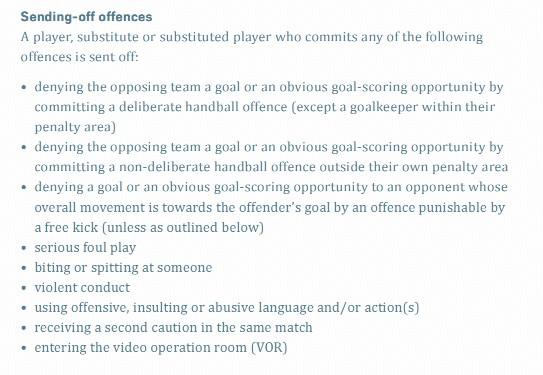 那麼,有類似“打隊友要被紅牌罰下”的規則嗎?爲此我們查閱了最新的IFAB足球競賽規則,其中對於“驅逐離場的犯規”是這樣描述的: