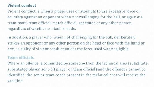 此外,球員在未爭搶球權時,故意用手或手臂擊打對手或任何其他人的頭部或面部也構成暴力行爲,除非所使用的力度可以忽略不計。