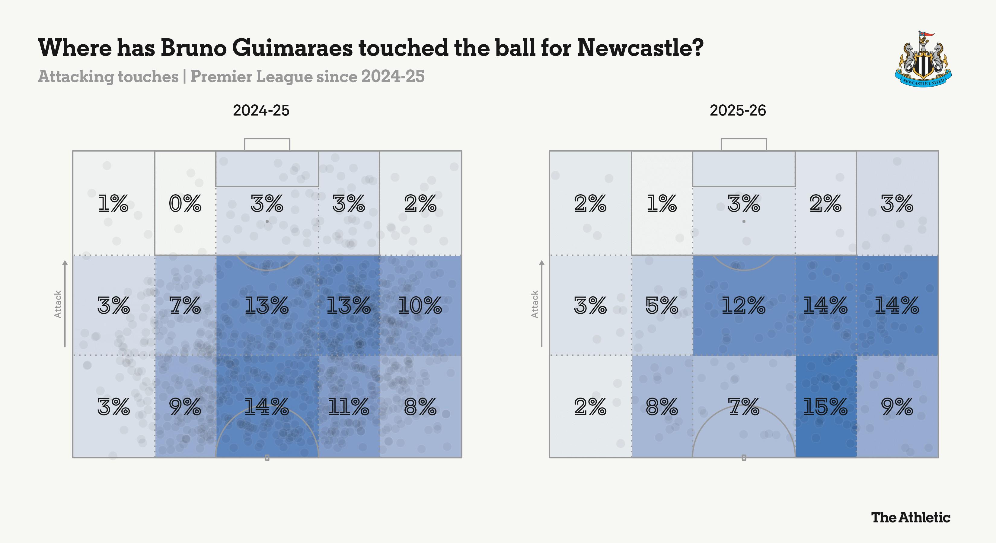 對於像吉馬良斯這樣出勤率極高的球員——上週六是這位巴西人第150次爲紐卡首發,自加盟以來,他在可能的176場比賽中出場了167次——他本應從中場位置提供更多進球。埃迪-豪一直積極鼓勵吉馬良斯更頻繁地進入禁區,併爲他設計了專項訓練,練習在正確的時間插入禁區。