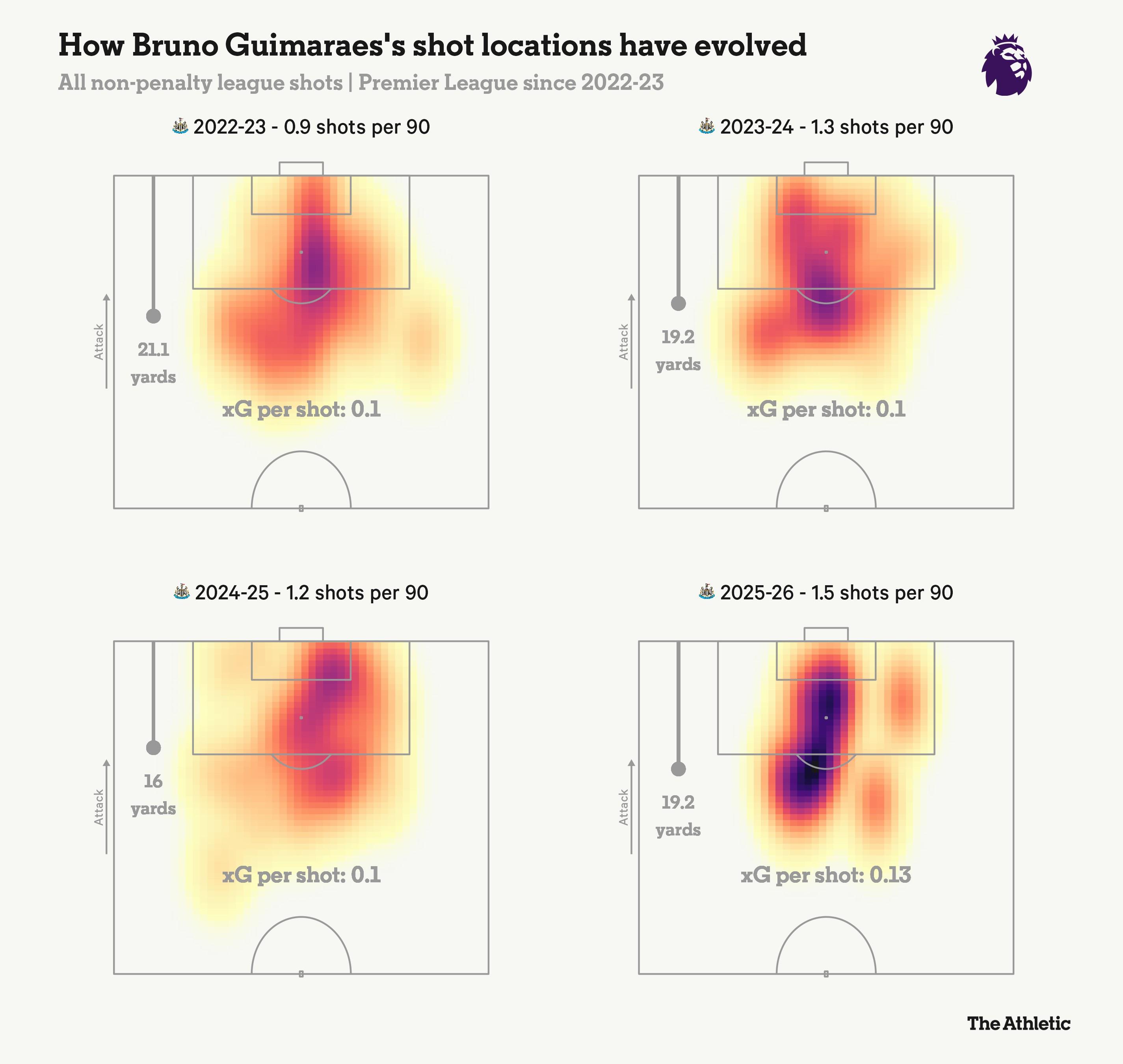 儘管如此,在2025-26賽季迄今爲止,他更多地從中路區域起腳射門,並且,雖然他的射門距離增加了,但射門質量(xG)卻提高了。雖然樣本量還很小,但跡象(和結果)是令人鼓舞的。