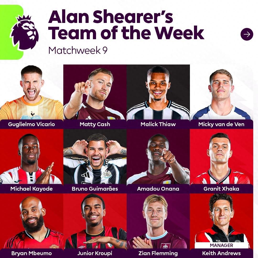 英超官方發佈了阿蘭-希勒評選的英超第9輪最佳陣容,姆伯莫、扎卡、範德芬、維卡里奧等人在列。