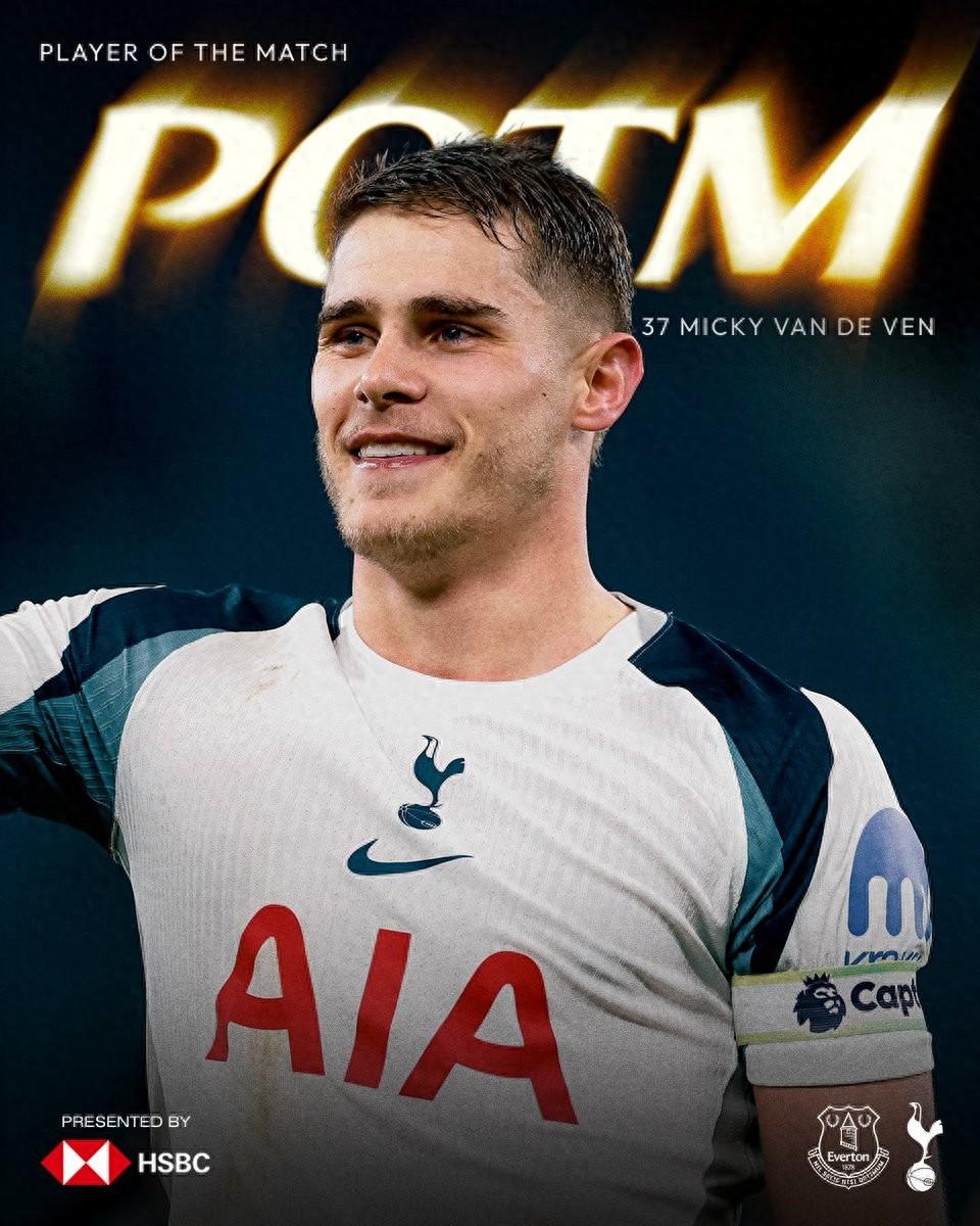熱刺官方宣佈,範德芬當選球隊與埃弗頓一役隊內最佳球員。