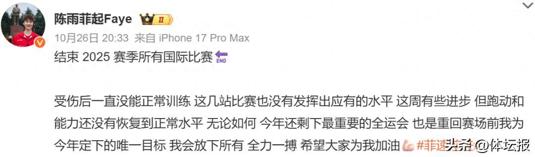 近日,陳雨菲在2025年法國羽毛球公開賽半決賽中鏖戰三局不敵安洗瑩,無緣決賽。至此,陳雨菲結束2025賽季所有國際比賽,她在賽後發文表示:今年還剩下最重要的全運會,是重回賽場前爲今年定下的唯一目標,會放下所有,全力一博。