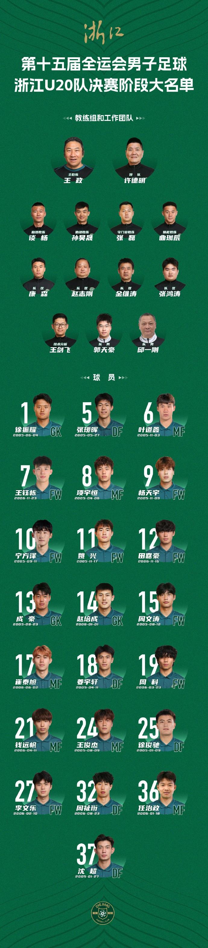 名單中主教練是王政,他是浙江足球的名宿,教練組則是有談楊、孫昊晟、曲珈辰等人。