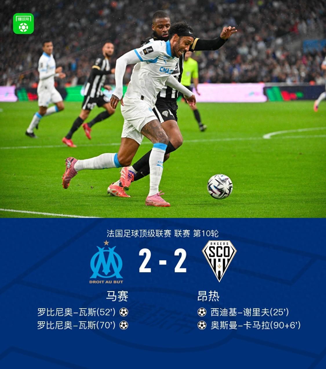 馬賽2-2昂熱,羅比尼奧-瓦斯雙響,奧斯曼-卡馬拉補時絕平