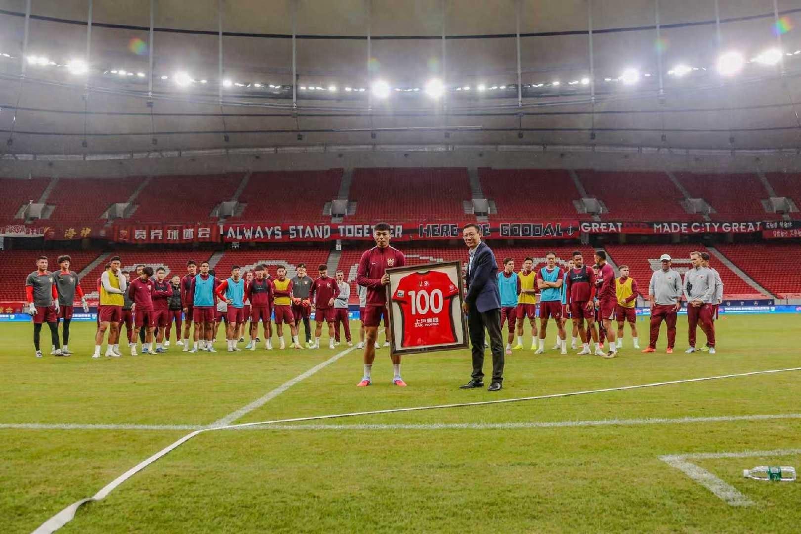 海港今日訓練前,黨總支書記沙良昌爲李帥頒發百場紀念球衣