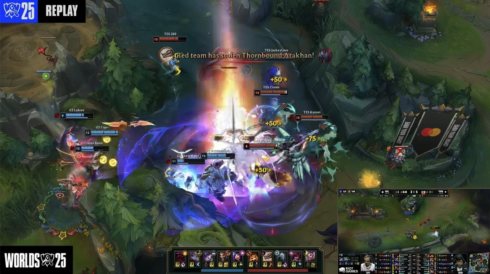 第20分鐘,G2先動厄塔汗,結果被Kanavi極限搶掉!隨後因爲打厄塔汗導致陣型和血量劣勢,TES打出0換3;