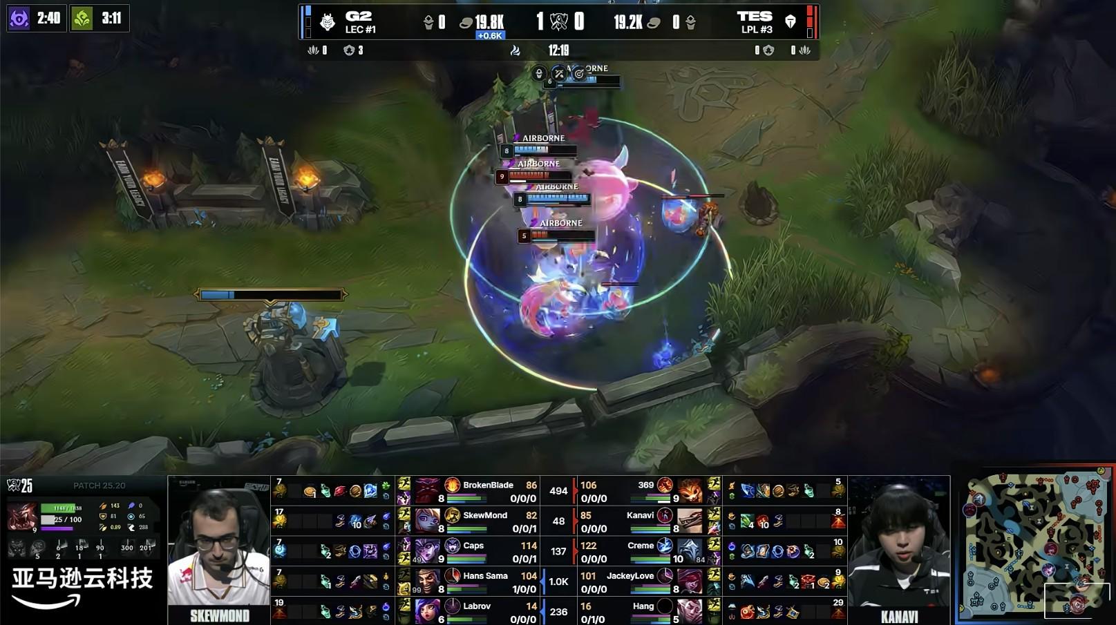 第19分鐘,G2憑藉此前收下的峽谷先鋒撞掉了TES的中路一塔;