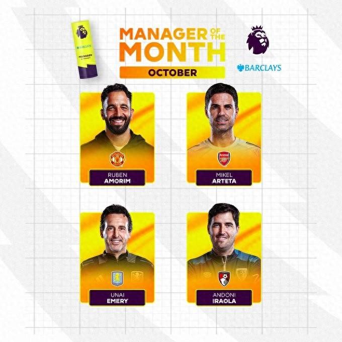 北京時間10月30日,官方消息,英超10月最佳主帥候選名單公佈,分別是阿爾特塔、阿莫林、埃梅里和伊勞拉。