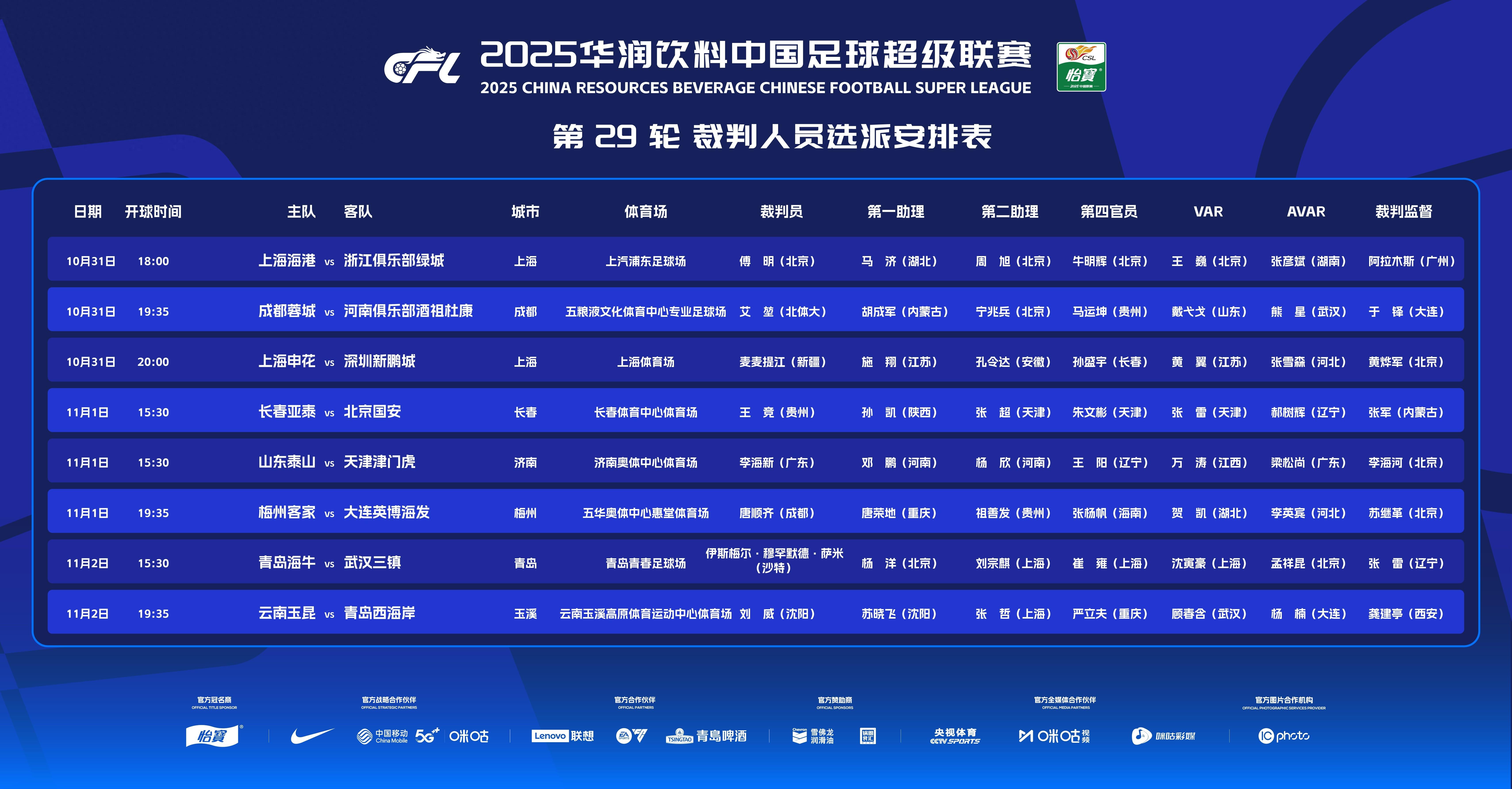 北京時間10月31日,中國足協官方公佈了中超29輪裁判選派安排表,其中傅明執法海港vs浙江,沙特籍裁判伊斯梅爾擔任海牛vs三鎮主裁。