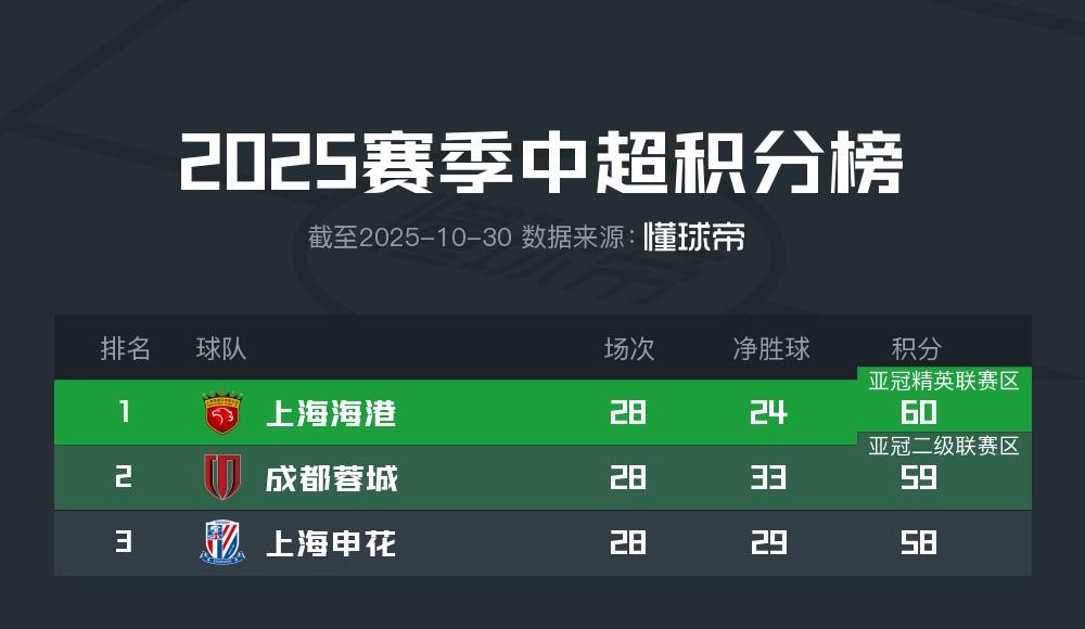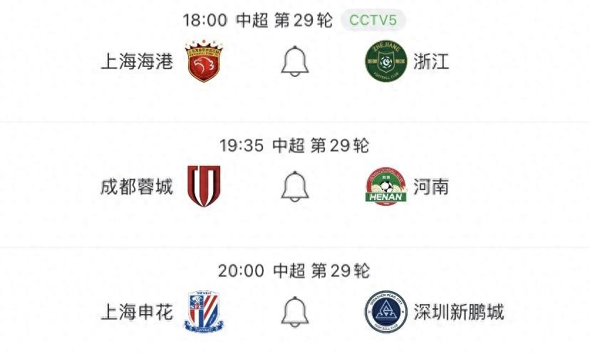 10月31日晚,2025賽季中超聯賽第29輪將接連進行3場比賽。18點,領頭羊上海海港主場迎戰浙江隊;19點35分,第二名的成都蓉城主場迎戰河南隊;20點,第三名的上海申花主場迎戰深圳新鵬城。