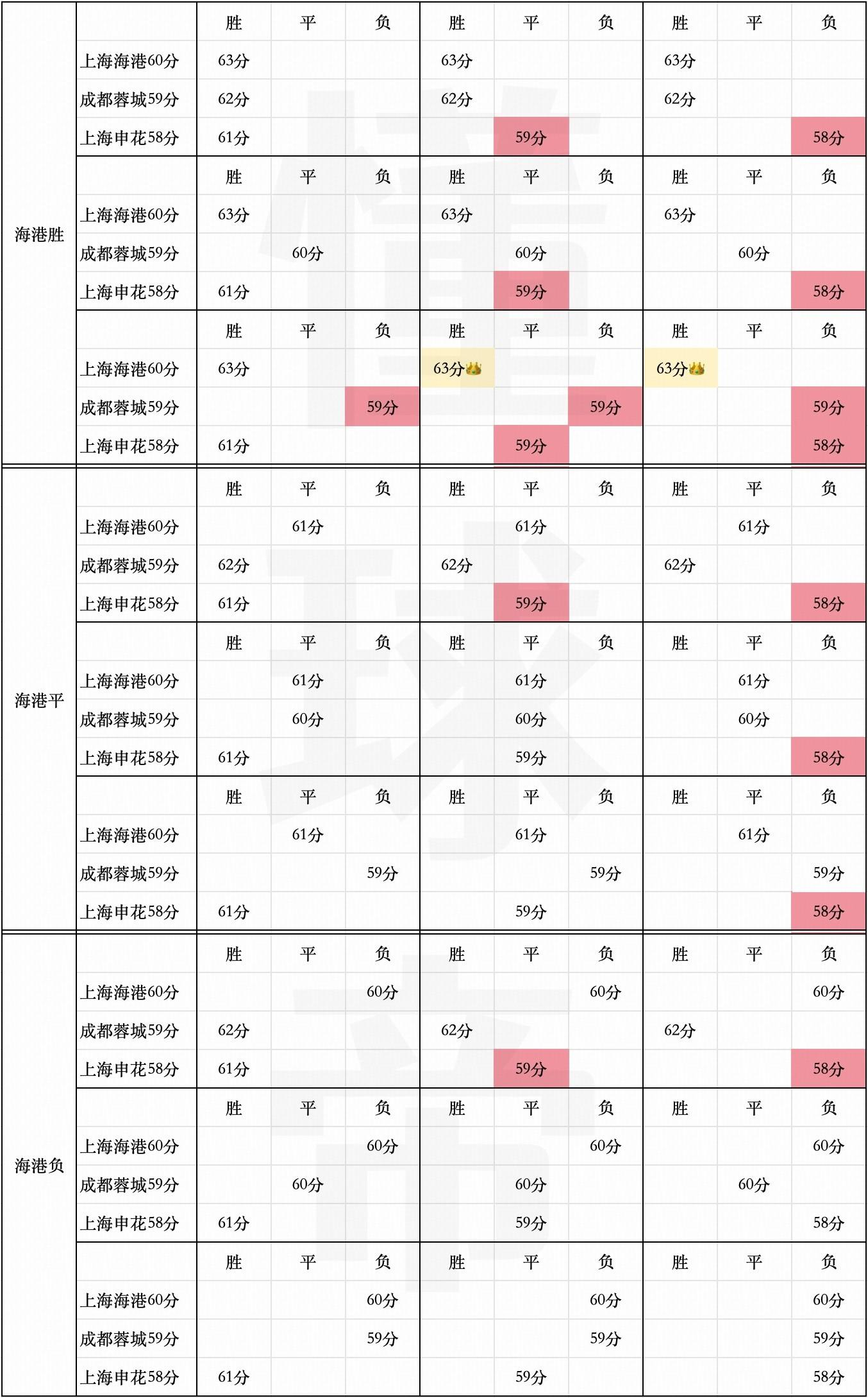 今晚的比賽會產生27種賽果組合,有14種可能是三隊到末輪繼續爭冠,有10種可能是海港與蓉城末輪爭冠,有1種可能是海港與申花末輪爭冠,有2種可能是海港提前奪冠。