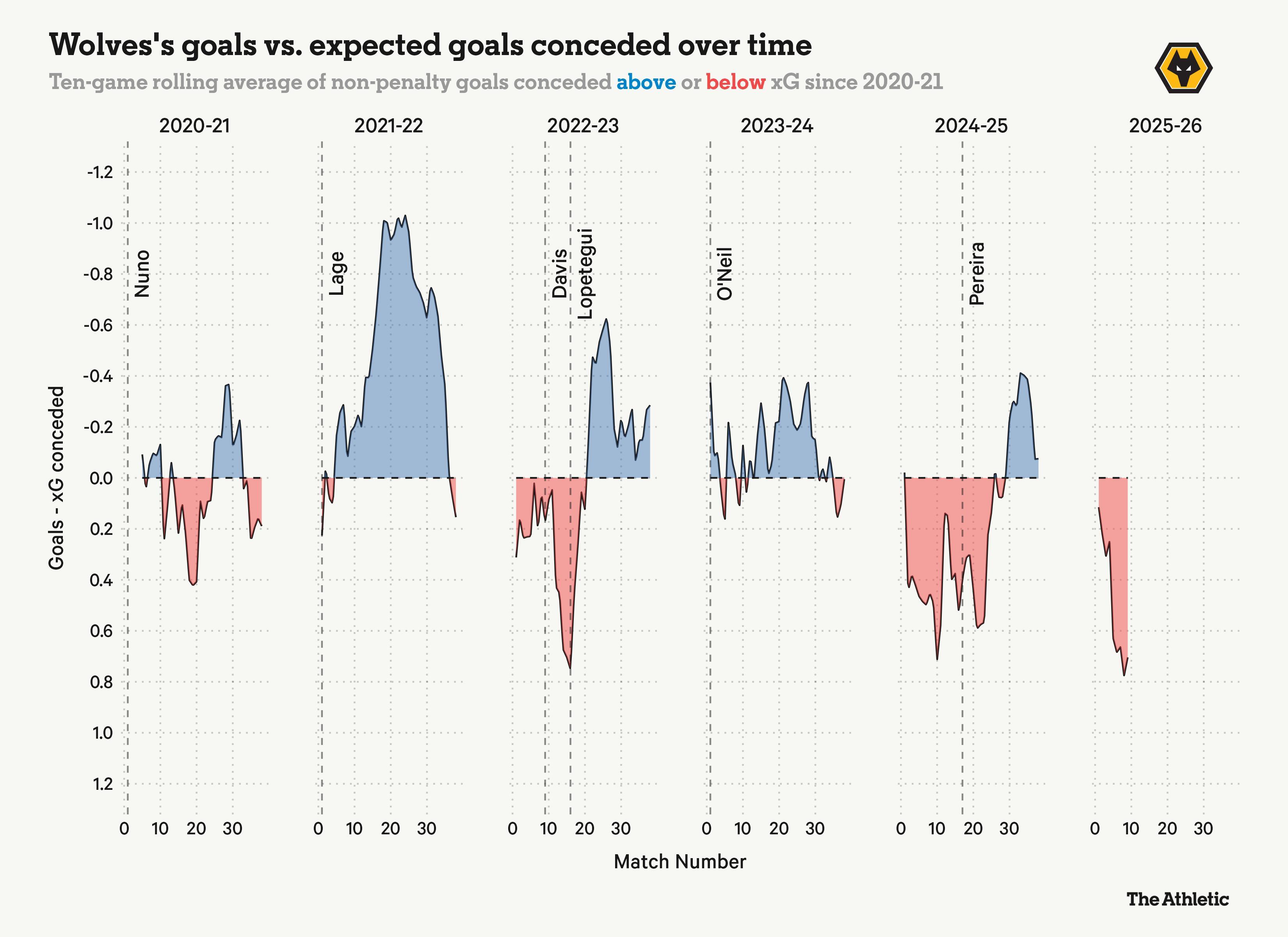 對狼隊來說,唯一的些許鼓勵是他們在九場比賽後的記錄與上賽季完全相同。和那時一樣,狼隊基於他們所面臨的高質量機會,實際丟球遠遠超過了預期,從11.5的預期失球中丟了19個。他們上賽季成功逆轉了這一趨勢,並需要再次做到這一點以自救。