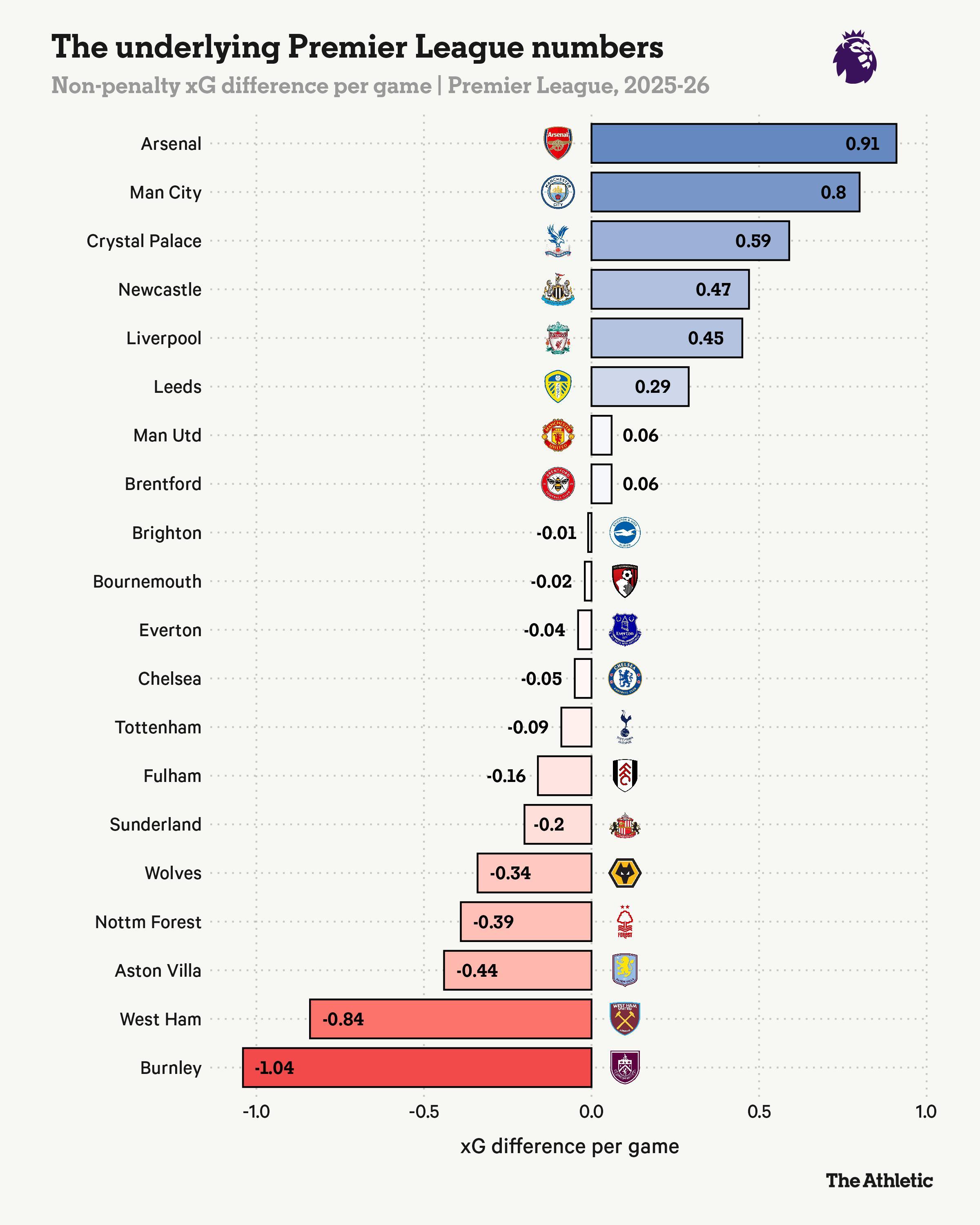 如果你想知道質量能在英超帶來什麼,看看曼城就知道了。他們的非點球預期失球與利茲聯相同,均爲8.2,但他們僅丟了六個非點球進球,而利茲聯則丟了12個。這就是區別所在。
