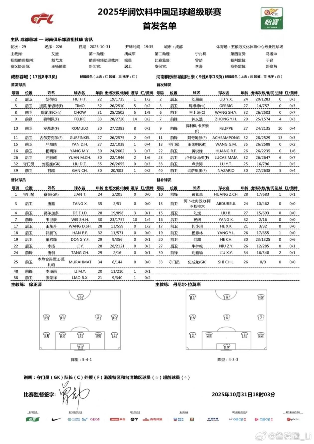 北京時間10月31日19:35,中超第29輪成都蓉城將坐鎮主場迎戰河南建業,艾堃出任本場主裁判。雙方賽前公佈首發名單。