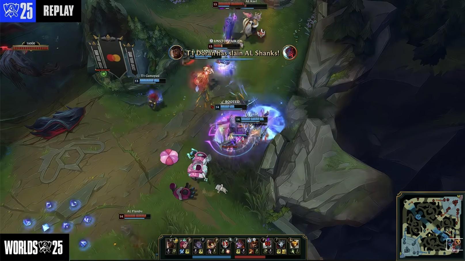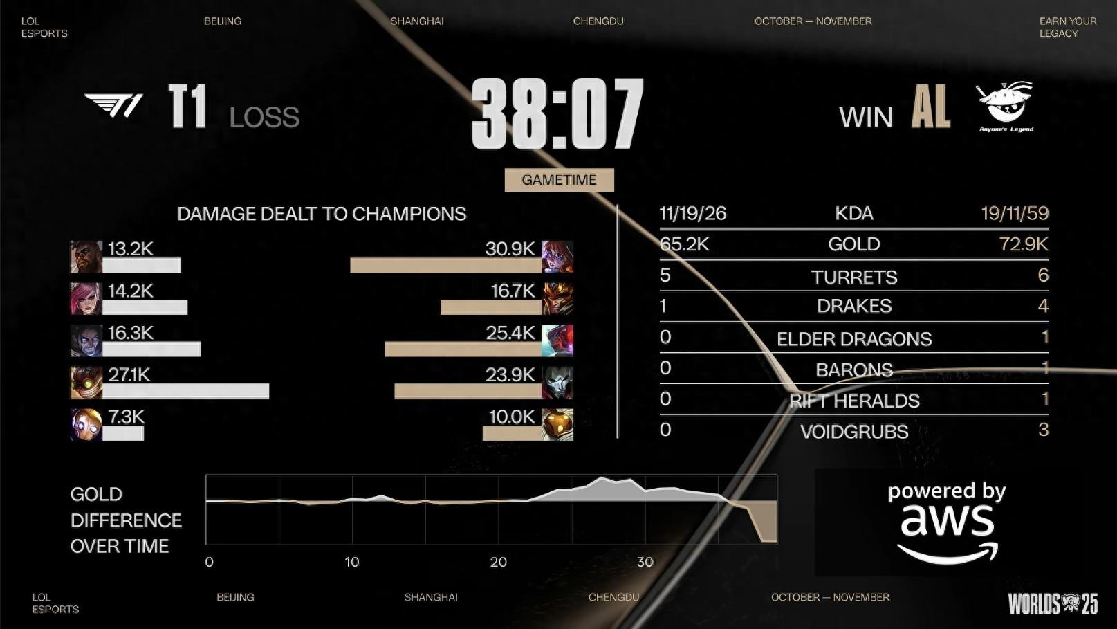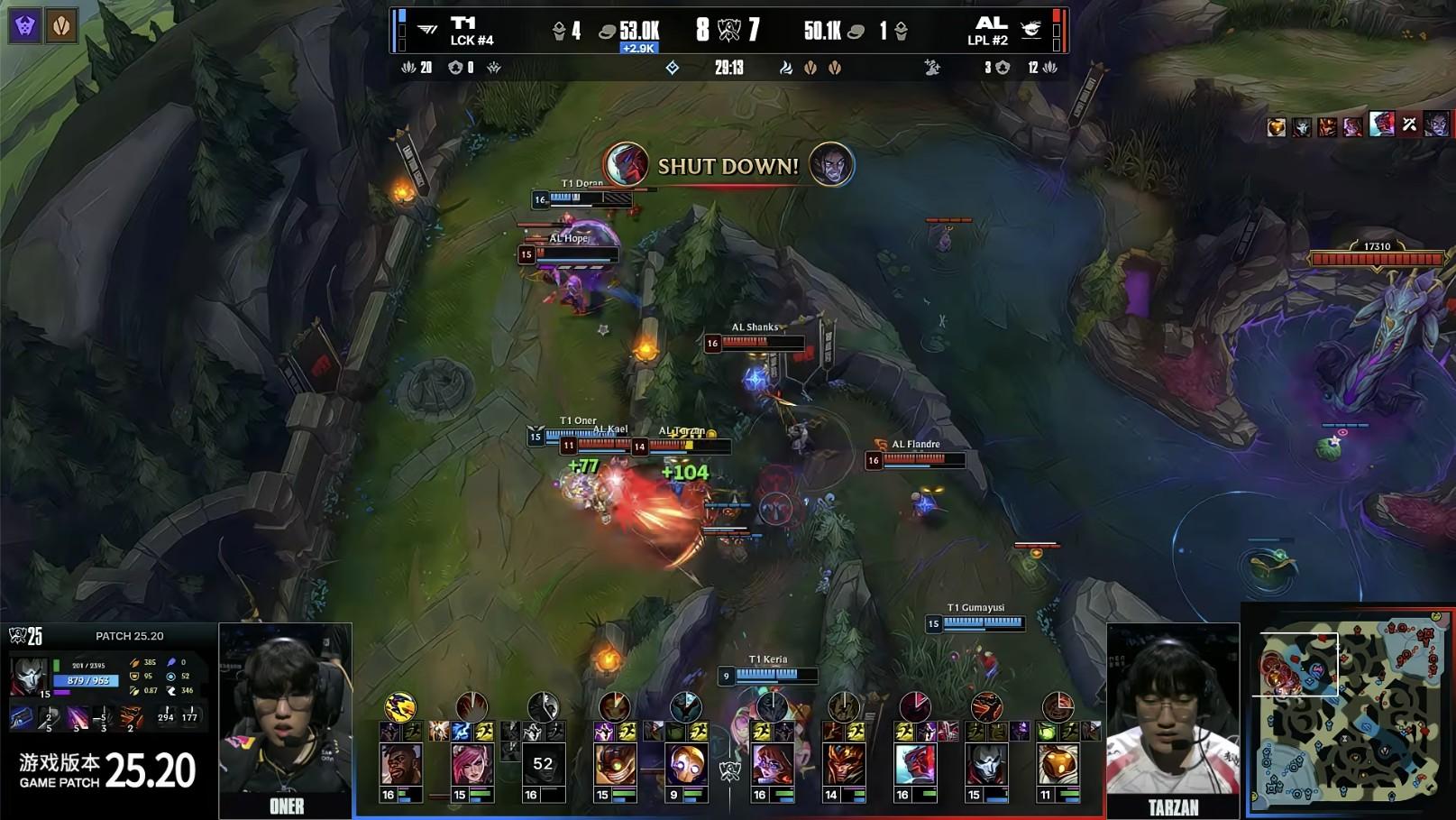 第15分鐘,Gumayusi被擊殺後AL成功收下峽谷先鋒,並且收下上路一塔,順利拿到本場先機;