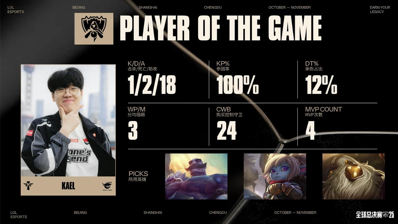 MVP連續第二局給到AL輔助Kael,本局他的巴德打出100%參團率。