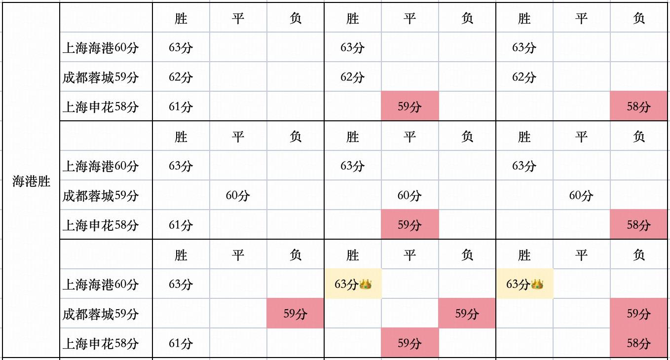 海港也有可能在今晚奪冠,前提是成都蓉城主場輸給河南隊(如果打平差3分,蓉城有交鋒戰績優勢),且申花主場不勝新鵬城。