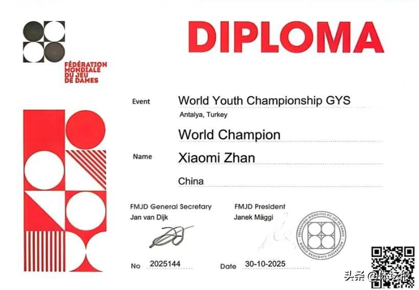 北京時間10月31日凌晨,世界國際跳棋聯合會(FMJD)的捷報從土耳其傳來——在2025年世界青少年國際跳棋錦標賽100格U8組慢棋賽中,紹興市柯橋區管寧實驗小學的7歲小將詹小米,以5勝4和積14分的不敗戰績力克20餘個國家的頂尖選手,問鼎世界冠軍。此外,來自麗水的姚佳穎獲得第六名。