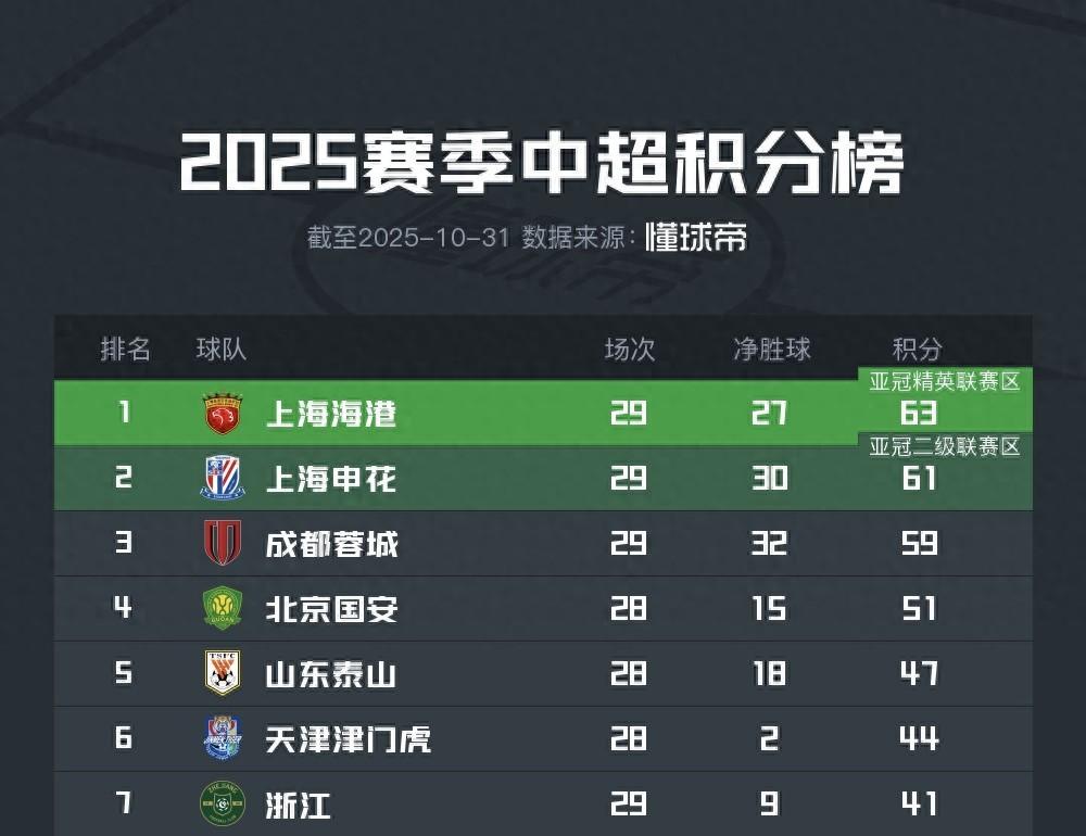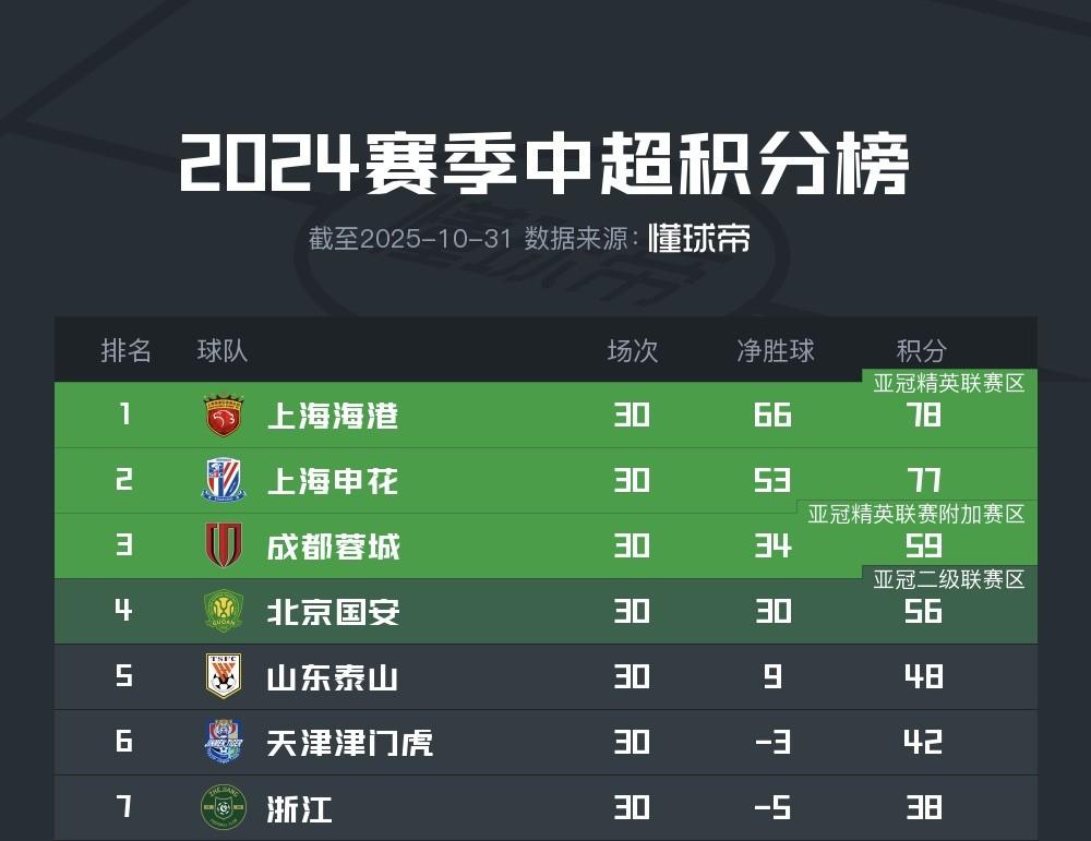 北京時間10月31日,中超第29輪先結束了三場爭冠關鍵戰。結果上海雙雄分別戰勝了各自的對手,而成都因爲不敵河南提前失去了爭奪冠軍的機會。有趣的是,這樣結束的賽果導致目前中超積分榜前7與上賽季最終的前7完全一致。