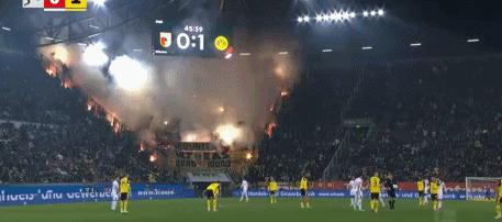 第46分鐘,氣氛熱烈,現場球迷燃放煙花