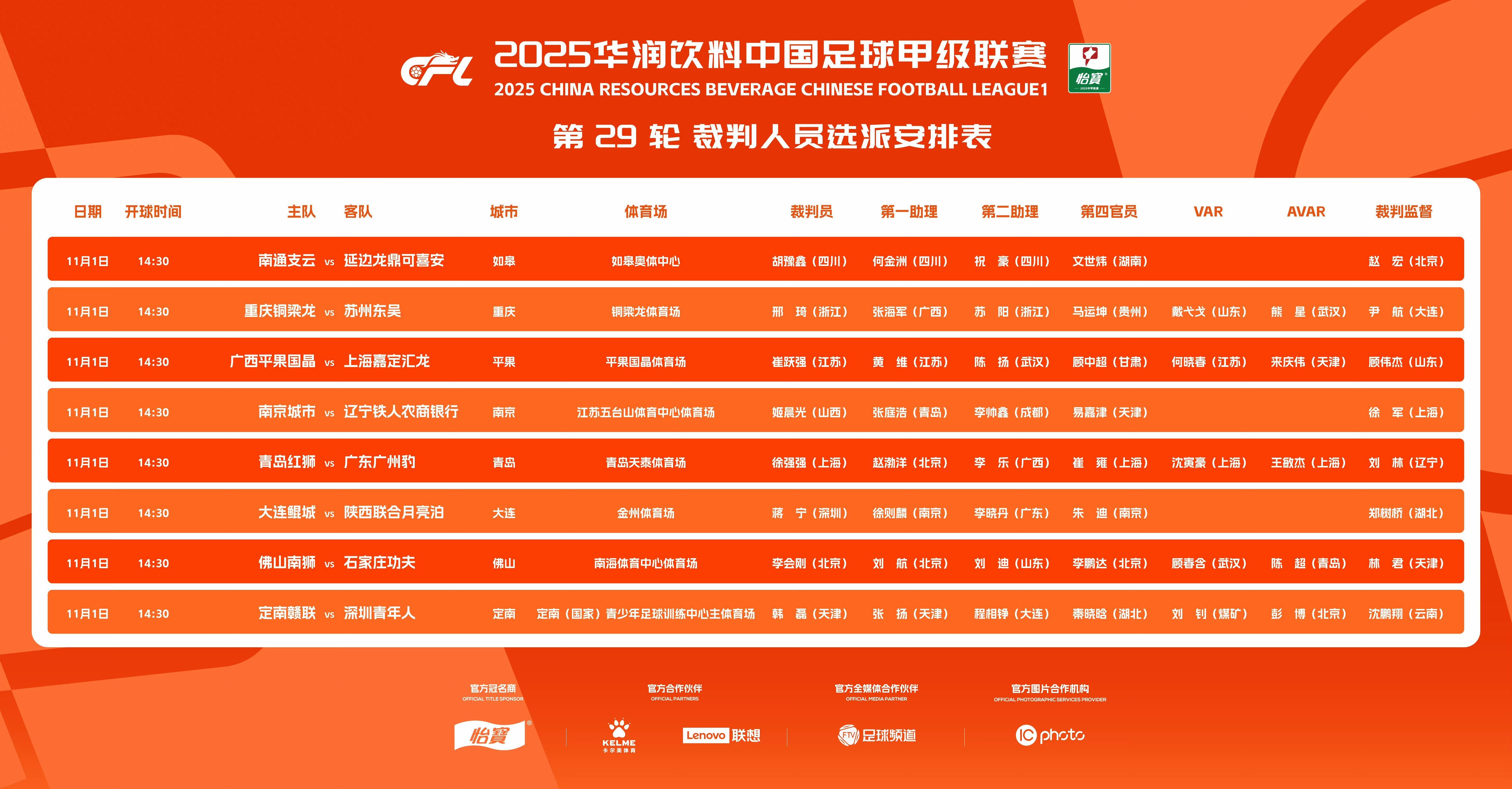 北京時間11月1日,中甲第29輪的裁判名單公佈,事關衝超、保級的比賽全部啓用VAR。