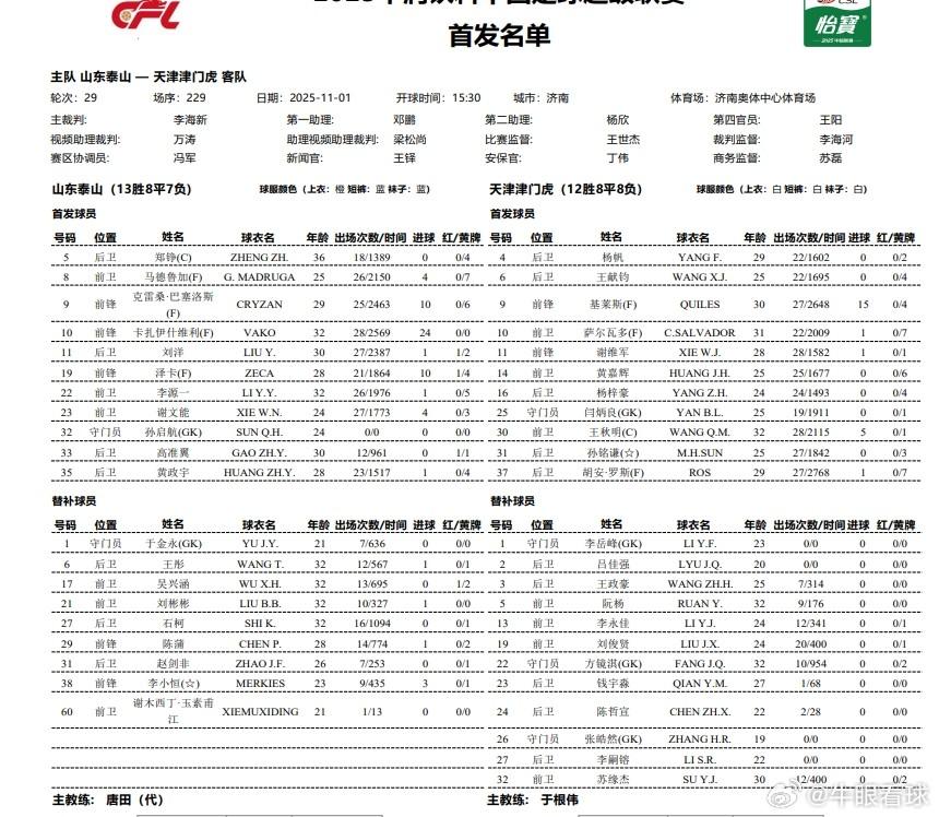 北京時間11月1日15:30,中超聯賽第29輪,山東泰山坐鎮主場迎戰天津津門虎,本場比賽主裁判是李海新,VAR是萬濤,賽前雙方公佈首發: