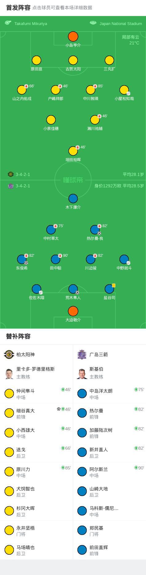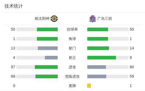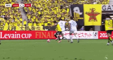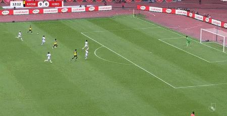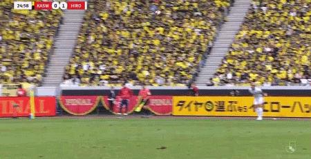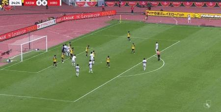 第25分鐘,大力手拋球至禁區,荒木隼人頭球破門,廣島三箭1-0柏太陽神