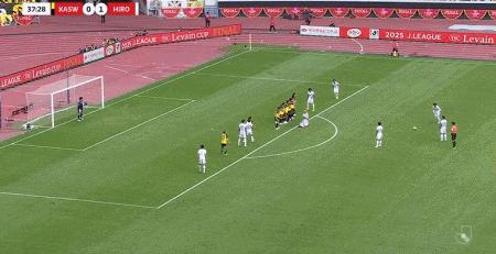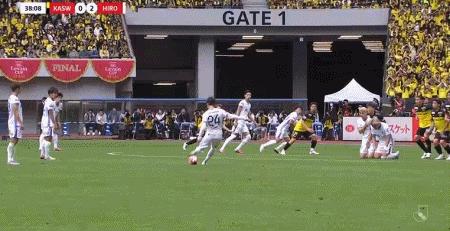 第38分鐘,東俊希任意球直接破門,廣島三箭2-0柏太陽神