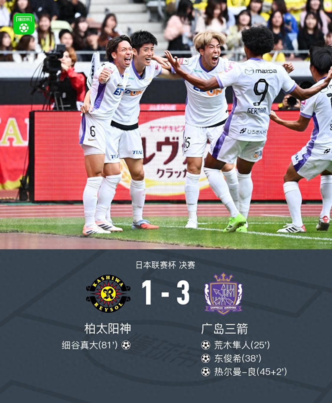 廣島三箭3-1柏太陽神奪冠,熱爾曼-良、東俊希建功