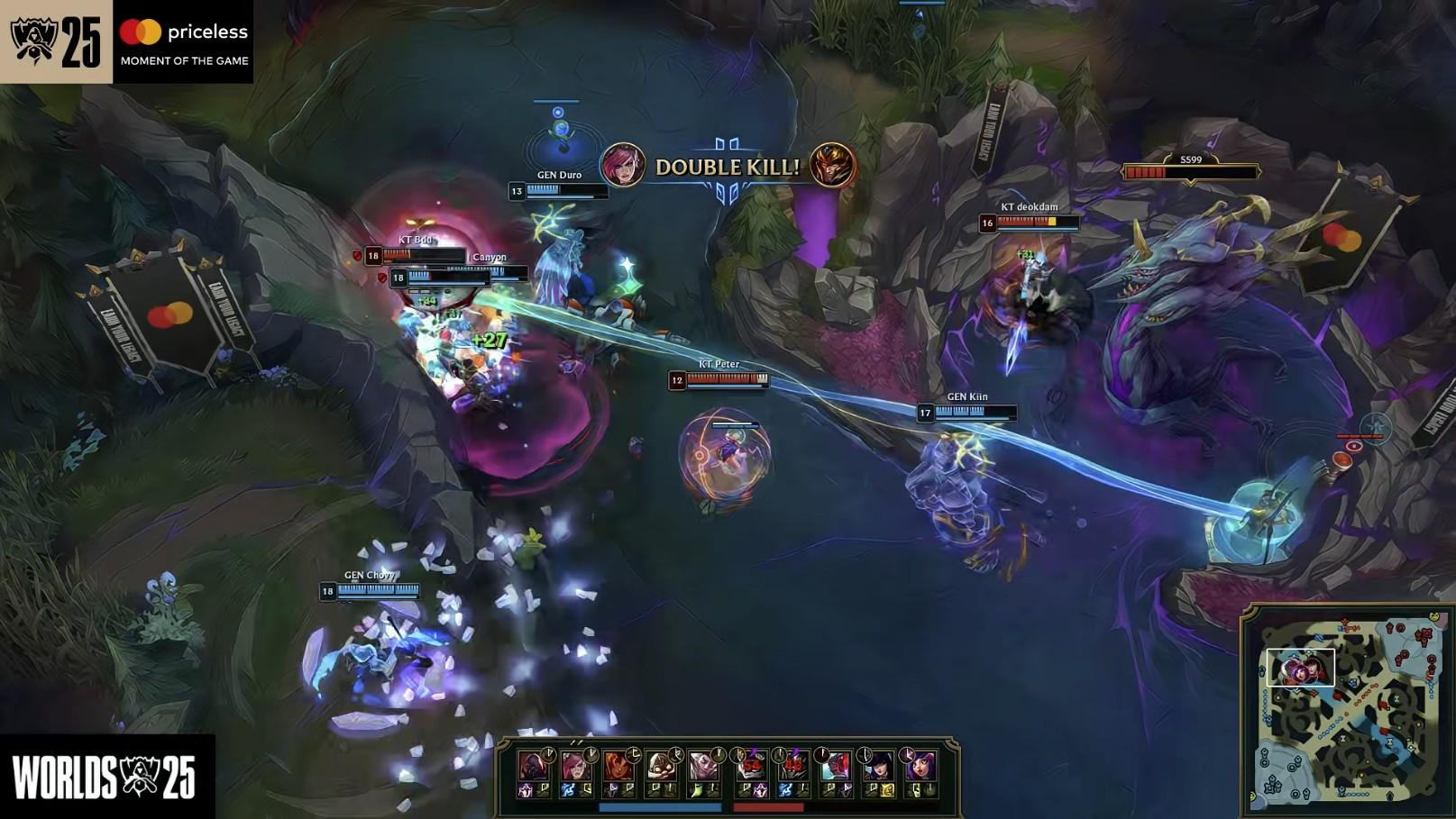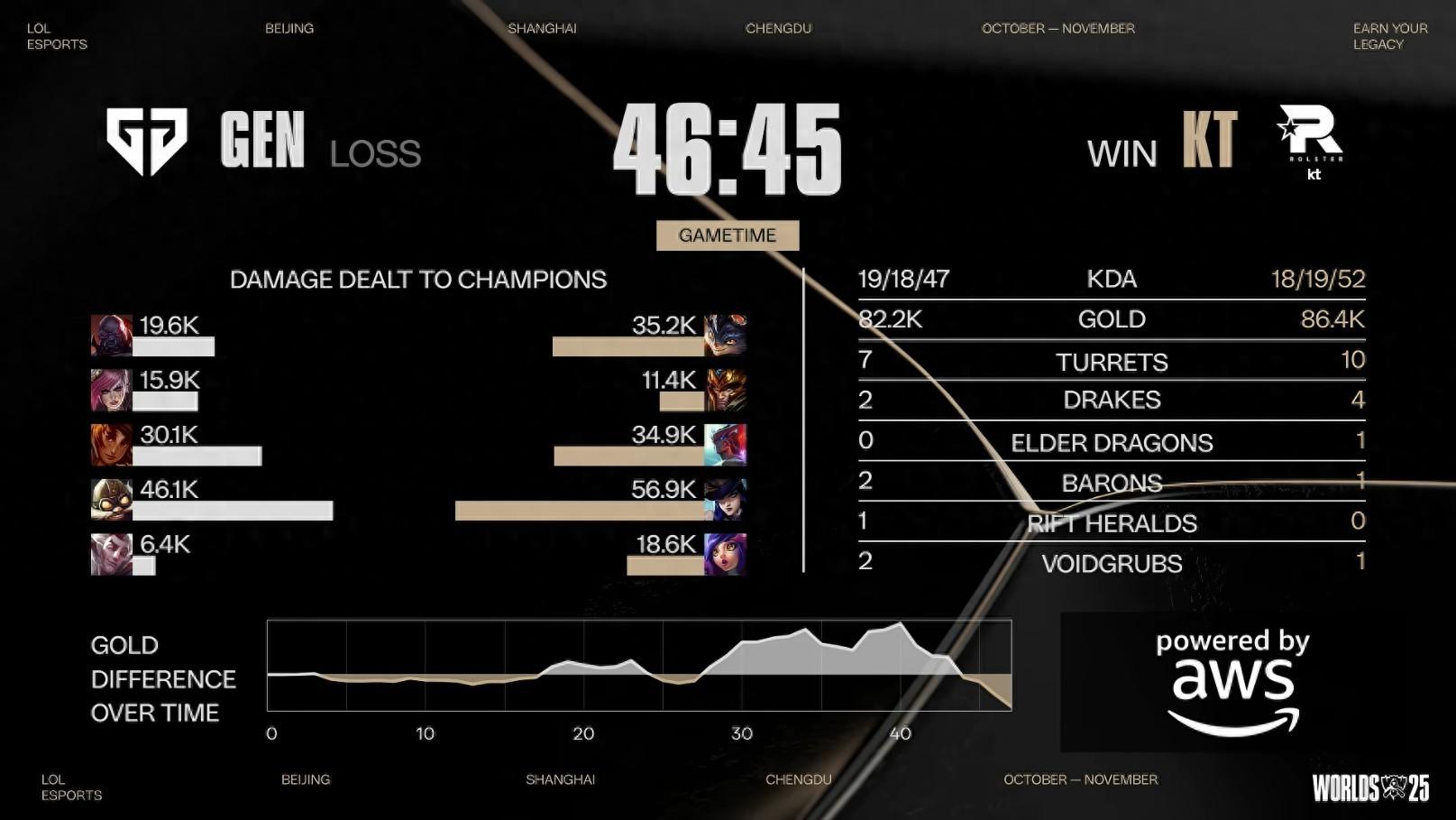 第46分鐘,KT帶大龍魂推進,GEN無法阻擋,第一局遊戲結束。