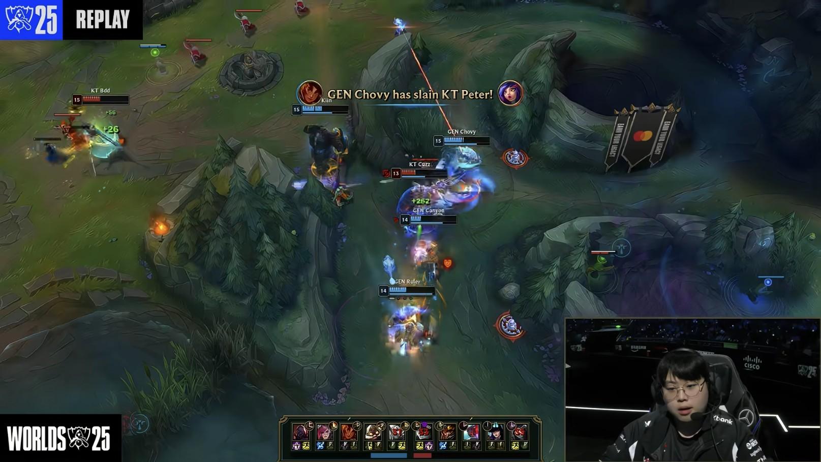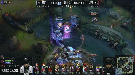 第15分鐘,GEN先手開動先鋒,隨後野輔果斷先手開到KT輔助Peter妮蔻,將其擊殺後順利收下先鋒;