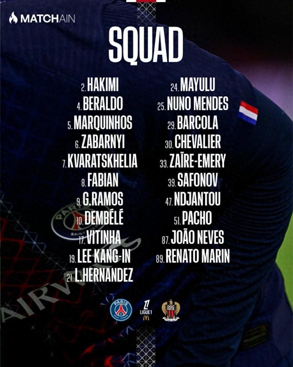 巴黎聖日耳曼官方公佈了法甲第11輪主場對陣尼斯的比賽大名單,登貝萊領銜,阿什拉夫、法比安-魯伊斯和李剛仁迴歸。