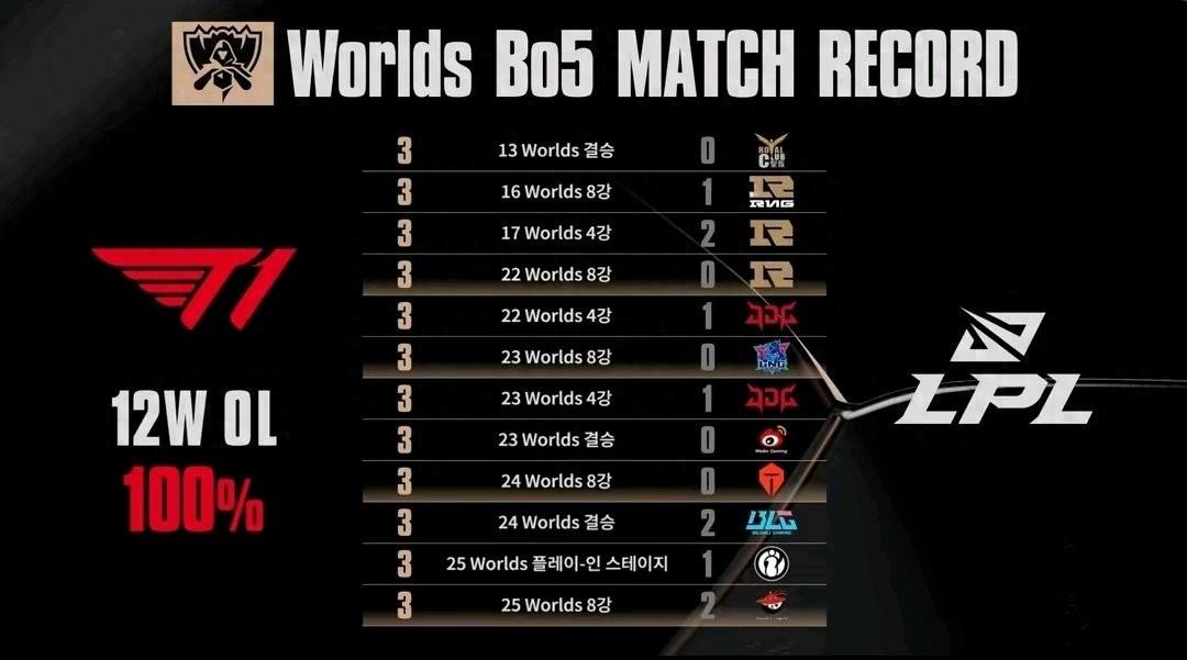 T1橫掃TES後,對LPL的世界賽BO5連勝紀錄擴大至12年13場