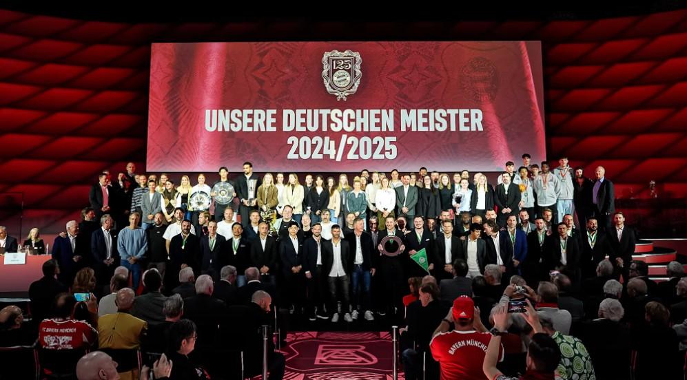 致辭結束後,海納邀請所有在場的德國冠軍隊伍登上舞臺合影。除男足、女足與男籃三支職業隊伍外,還包括32歲以上元老足球隊、40歲以上元老籃球隊、U19男籃與U19乒乓球隊。“你們就是拜仁慕尼黑——你們都是冠軍。” 海納說道。