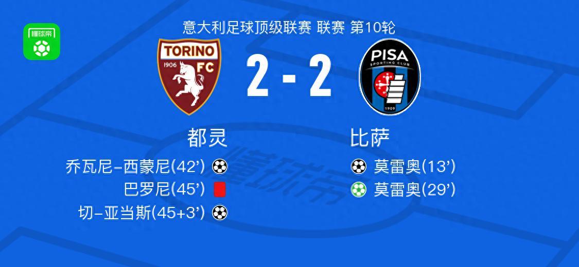 北京時間11月2日,意大利足球頂級聯賽第10輪,都靈主場迎戰比薩。比賽中,比薩球員萊里斯送出助攻,莫雷奧率先破門。隨後,莫雷奧再次站上罰球點,將球穩穩罰入,幫助球隊擴大優勢。都靈方面由喬瓦尼-西蒙尼接應進攻完成破門,爲球隊扳回一城。上半場臨近結束前,都靈再遭打擊,巴羅尼被紅牌罰下。補時階段,切-亞當斯抓住機會打入關鍵進球,幫助都靈在半場結束前追平比分。最終雙方以2比2握手言和。