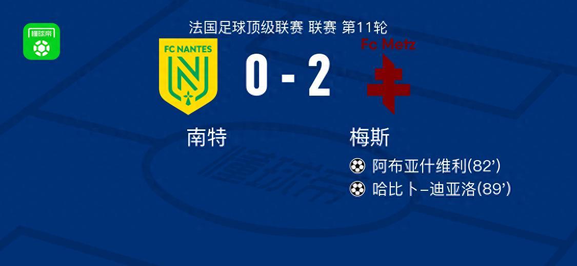 北京時間11月3日,法國足球甲級聯賽第11輪,南特主場迎戰梅斯。比賽中,阿布亞什維利爲梅斯打破僵局,隨後薩巴利送出助攻,哈比卜-迪亞洛再下一城,幫助球隊擴大領先優勢。最終,梅斯以2比0客場戰勝南特。